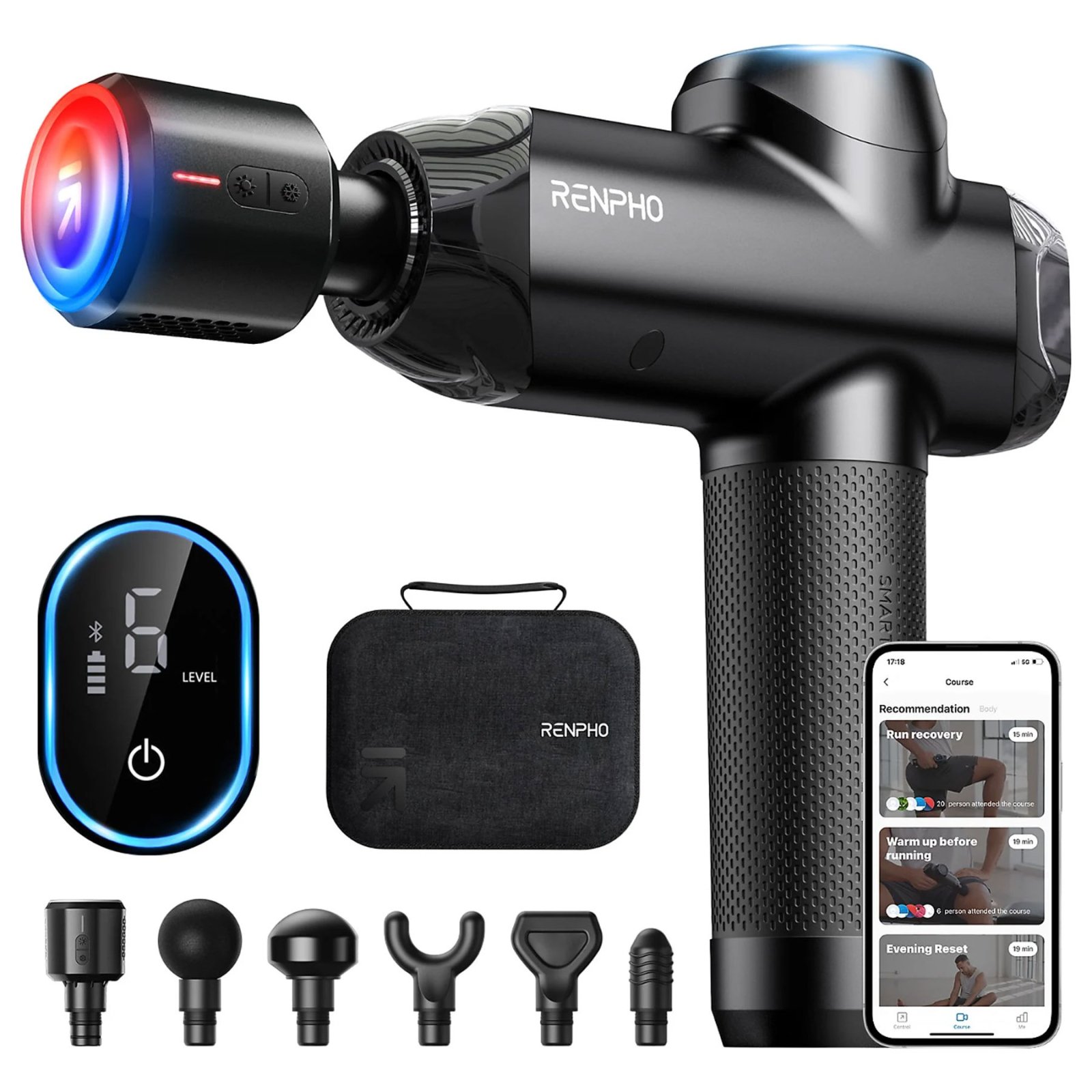 Aparat de masaj Gun Renpho Thermacool Power+, Incalzire si racire, 6 capete, 5 viteze, Control din telefon Bluetooth