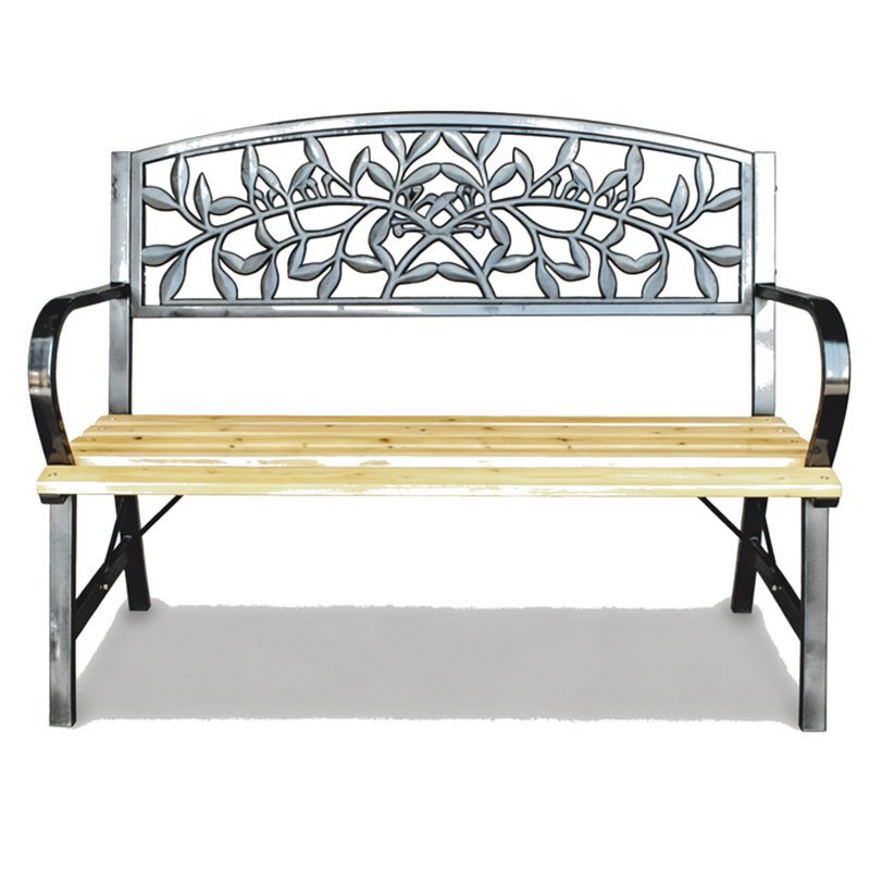 Specification: Banca de gradina din lemn si otel cu spatar decorativ model frunze, 120x56x87 cm, negru si maro natur