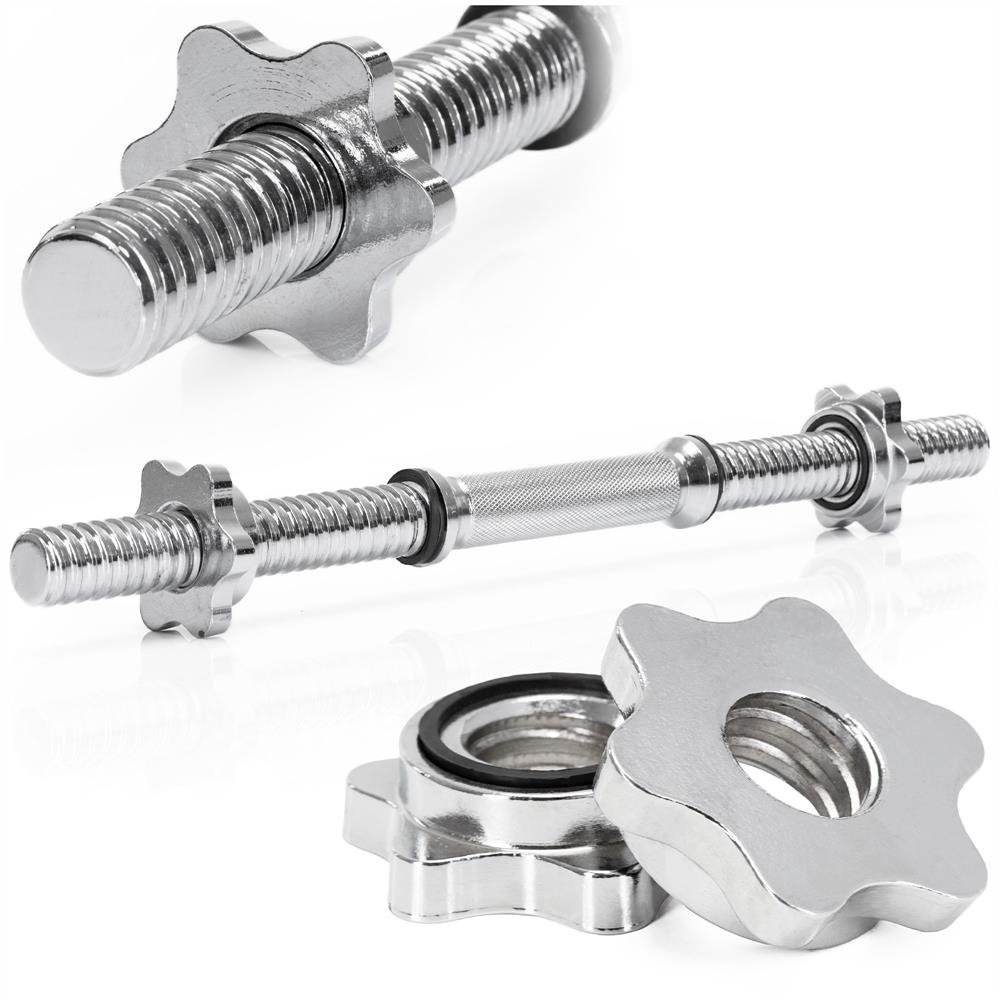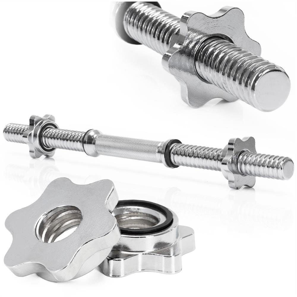 Specification: Bara gantera scurta 48 cm, diametru 28 mm, otel cromat, capacitate 80 kg, argintiu