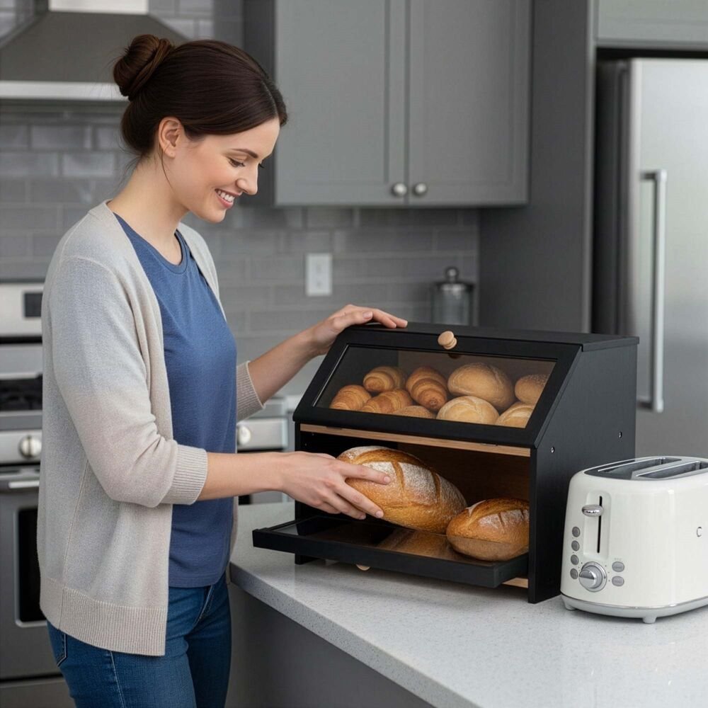 Be the first to review “Cutie pentru paine cu 2 niveluri din bambus, cu ferestre transparente si inchidere magnetica, 39x25x32 cm, negru”