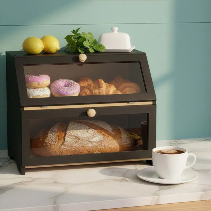 Cutie pentru paine cu 2 niveluri din bambus, cu ferestre transparente si inchidere magnetica, 39x25x32 cm, negru