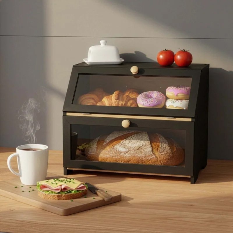 Specification: Cutie pentru paine cu 2 niveluri din bambus, cu ferestre transparente si inchidere magnetica, 39x25x32 cm, negru