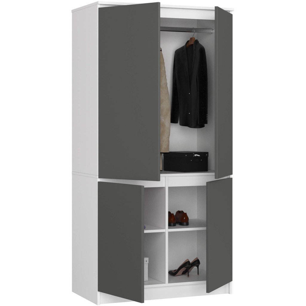 Dulap cu 4 usi, rafturi si bara pentru umerase, PAL laminat, 90x51x180 cm, alb si gri grafit