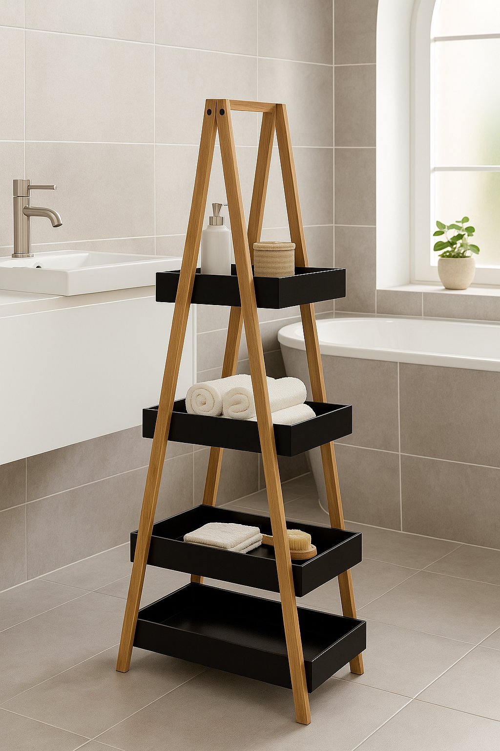 Specificatii tehnice Marca: 5Five Model: Natureo Culoare: Negru Material: Bambus si MDF E1 Dimensiuni produs: L. 30 x P. 18,5 x H. 81,7 cm Scurta descriere Etajera 5Five Natureo cu 3 rafturi si finisaj negru este o piesa eleganta si functionala pentru spatii restranse. Cu structura in A si detalii din bambus, ofera un stil contemporan si natural perfect pentru baie, hol sau birou. Caracteristici principale 3 rafturi deschise pentru depozitare practica Cadru stabil din bambus cu design in A Finisaj negru modern, usor de integrat Compacta si eficienta pentru spatii mici Materiale durabile si usor de curatat