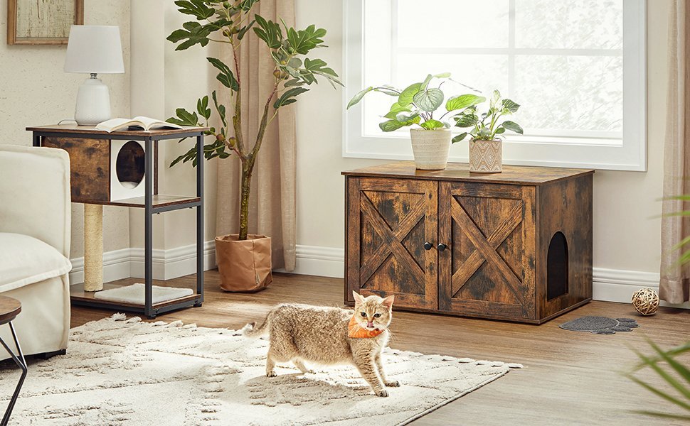 Detalii despre produs: Culoare: Maro Materiale: Placi aglomerate Dimensiuni: 80 x 53 x 49,2 cm (L x l x i). Greutate: 15,8 kg Capacitate de incarcare statica a suprafetei (cu separator): 60 kg Capacitate de incarcare statica a placii de baza: 30 kg Despre acest articol Cu stilul sau rustic si usile elegante de hambar, aceasta litiera se integreaza cu usurinta in locuinta dumneavoastra.Datorita constructiei inchise, aceasta litiera pentru pisici ofera un loc privat unde pisica dvs. se simte in siguranta pentru a-si face urgentele si mai putina mizerie – o solutie avantajoasa pentru ambele parti!Cu o dimensiune de 50 x 50 x 46 cm, compartimentul principal al acestui dulap pentru pisici ofera suficient spatiu pentru pisici. De asemenea, puteti indeparta separatorul pentru a mari suprafata la 74,9 x 50 x 46 cm.Un singur produs, mai multe utilizari: Plasati inauntru o litiera pentru pisici, folositi-o ca masa laterala sau plasati un pat pentru pisici inauntru pentru a crea un adapost confortabil.Cu instructiuni pas cu pas si piese etichetate, aceasta litiera pentru pisici este gata in 20 de minute.