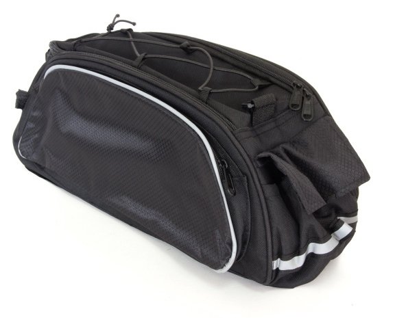 Geantă de bicicletă spațioasă cu 4 compartimente pentru portbagaj, fabricată din poliester rezistent la apă și ușor de curățat. Extrem de util în timpul călătoriilor mai lungi și mai scurte cu bicicleta. Geanta a fost echipată cu un compartiment principal de 15 litri și 3 buzunare suplimentare cu fermoar (două fermoare laterale și cel din spate cu velcro). Un suport suplimentar pentru sticle facilitează transportul băuturilor cu tine. Geanta are și elemente reflectorizante care ne sporesc siguranța și o fac vizibilă după întuneric. Geanta este montată pe suportul pentru biciclete (în spate) cu curele de velcro. Îl puteți folosi și ca geantă de mână, datorită curelei și mânerului atașat – astfel încât să decideți asupra scopului său!