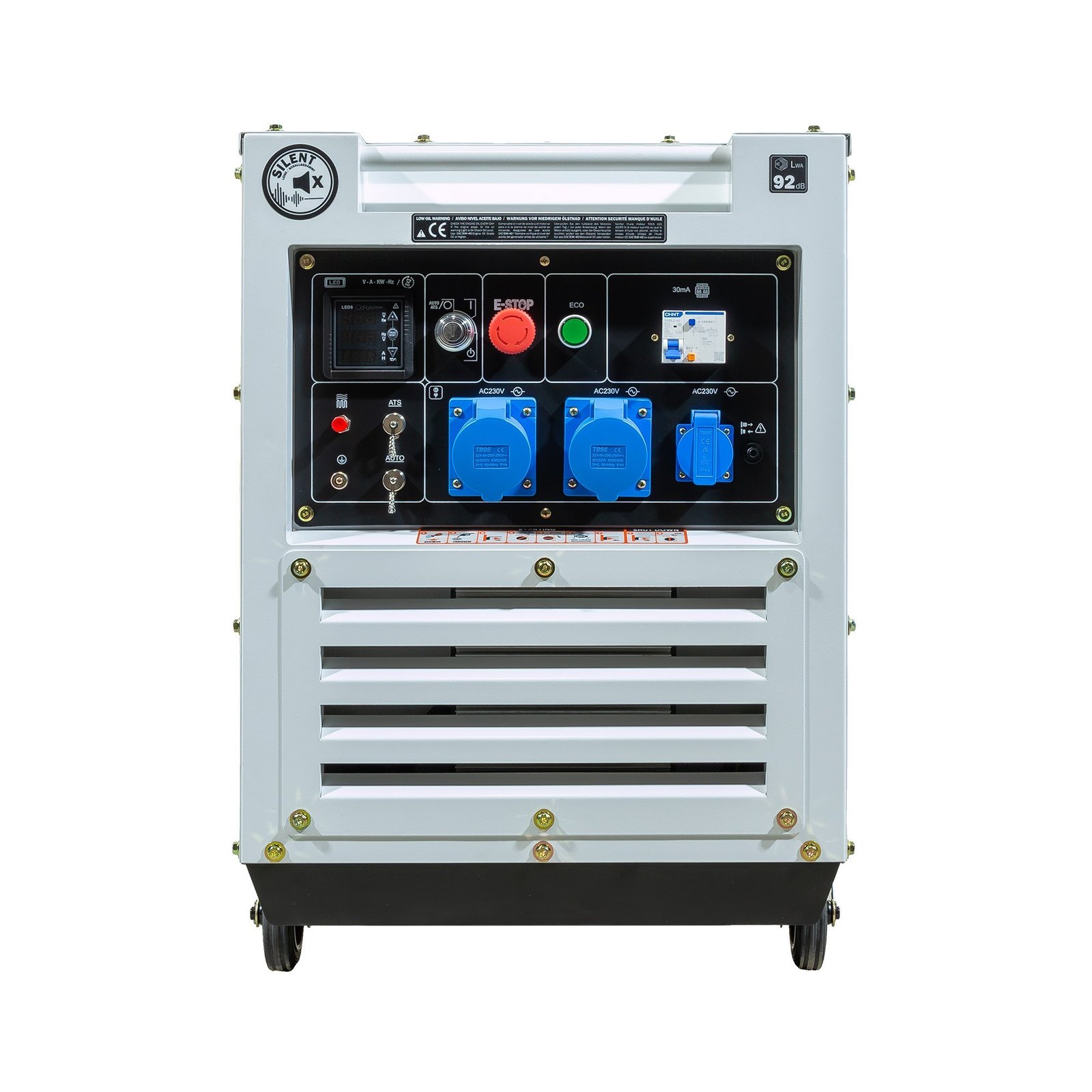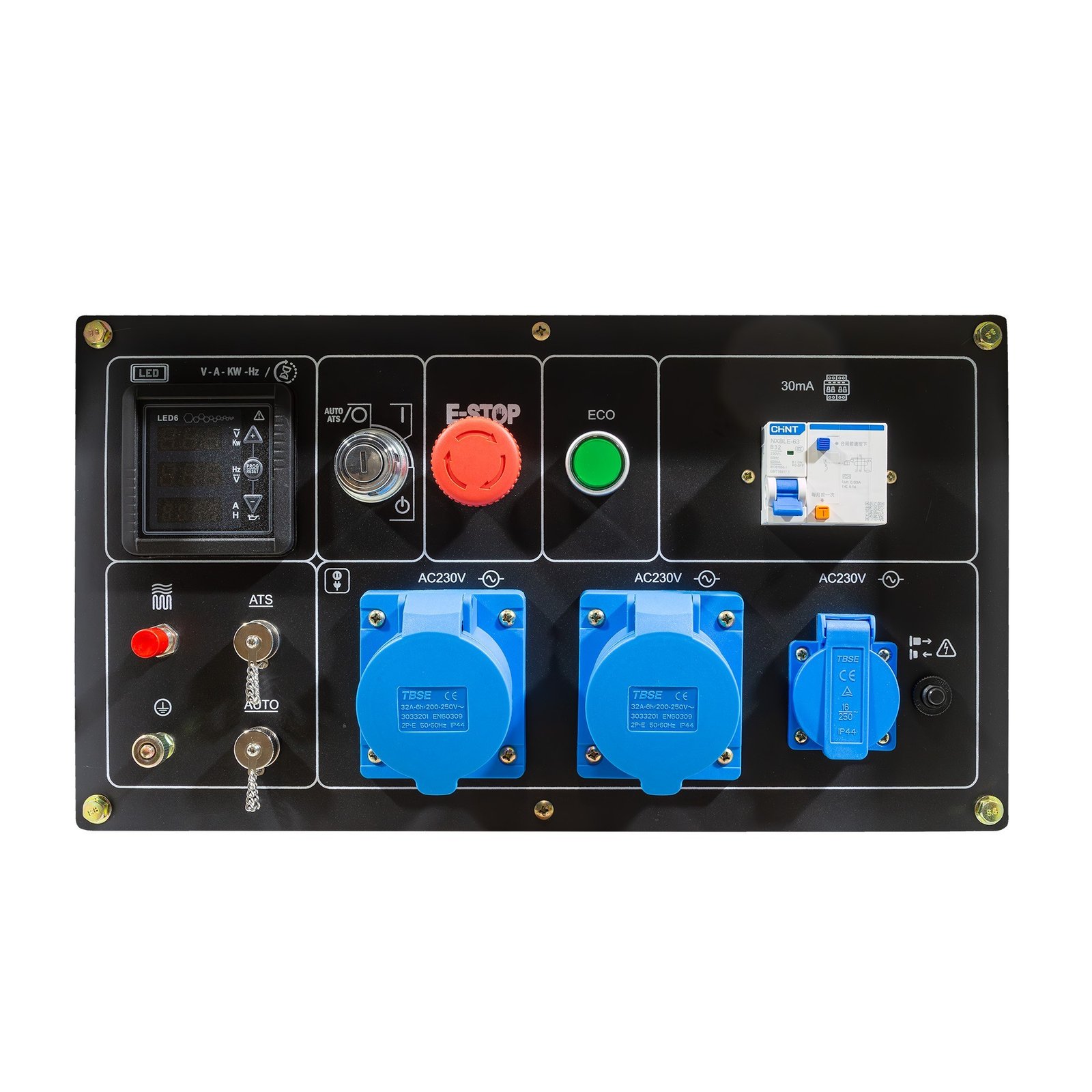 Cu 143 kg si 800x525x740 mm este cel mai compact inverter diesel din gama. Conectorul AUTO dedicat permite integrarea cu invertoare hibride (Deye, Growatt, Victron) pentru pornire automata.