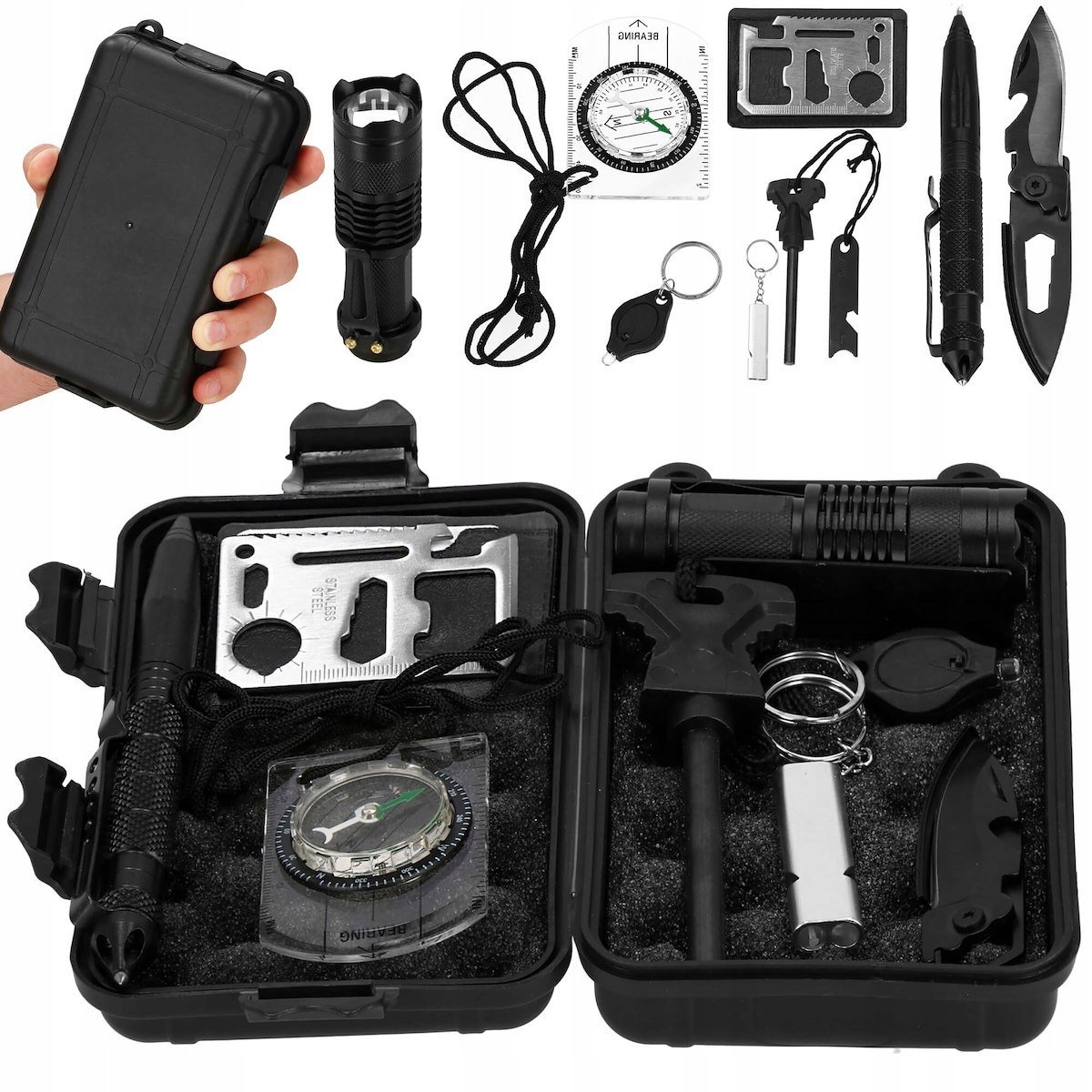 KIT DE SUPRAVIETUIRE MULTIFUNCTIONAL Numarul de articole: 9Material: otel inoxidabil / plasticDimensiuni cutie: 17 x 10 x 5 cmTrusa de supravietuire completa are toate elementele esentiale de care aveti nevoie pentru expeditia dumneavoastra. Creat cu gandul la siguranta si confort, pentru activitati in aer liber si nu numai. Echipeaza-te cu kitul nostru si fii sigur ca nimic nu te va mai surprinde! AVANTAJELE KITULUI DE SUPRAVIETUIRE Materiale de inalta caltiate Utilizarea universala a multor elemente Idee perfecta de cadou Husa de transport – pentru depozitare si transport usor Pachetul creste siguranta si confortul Este un accesoriu perfect pentru echipamentul de supravietuire MATERIALE DE INALTA CALITATE In procesul de productie am folosit materiale extrem de robuste, care contribuie la durabilitatea tuturor accesoriilor. Intregul set este depozitat intr-o carcasa practica, umpluta cu spuma. Veti putea depozita fiecare element al setului cu usurinta si in siguranta. CE ESTE INCLUS IN TRUSA DE SUPRAVIETUIRE 1x cremene + pahar de masurare cu desfacator de sticle1x fluier1x stilou tactic + spargator de sticla + clema puternica – lungime 14,5 cm1x card multifunctional – 11 utilizari posibile1x cutit tactic pliabil – pliat: lungime 8 cm / desfasurat: 13 cm1x lanterna tactica – cu fascicul de lumina reglabil + clema puternica / lungime: 10 cm, diametru: 5 cm1x cutie de depozitare: 17 x 10 x 5 cm1x busola cu rulment / banda de masura / snur de agatat1x lumina cu 1 dioda tactila CUTIT TACTIC PLIABIL Cutitul are un design pliabil, ocupa putin spatiu atunci cand nu este folosit si este sigur pentru utilizator. Greutatea redusa si manerul robust permit ca produsul sa fie atasat, de exemplu, la o bucla de pantaloni, astfel incat sa fie intotdeauna la indemana. LANTERNA Dimensiuni mici, greutate redusa si cu un control intuitiv al luminii, acestea sunt caracteristicile pe care le are lanterna noastra la indemana! In plus, este dotata cu un clip, care va va permite sa o atasati la centura. Alimentata cu 1 x baterii AA (nu sunt incluse), are 3 functii de lumina: constanta / 50% / stroboscopica. STILOU TACTIC Setul robust de stilou intr-o carcasa metalica rezistenta este echipat cu un spargator de sticla. Clipul integrat va permite sa plasati stiloul oriunde doriti. CREMENE DE MAGNEZIU Pistolul cu cremene este o necesitate de supravietuire. Acesta va va permite sa aprindeti un foc de tabara in toate conditiile, chiar si in cele extrem de critice. CARD MULTIFUNCTIONAL 11 in 1 Un card de otel de dimensiunea cartii de credit este instrumentul multifunctional perfect. Il puteti utiliza ca:Fierastrau unghiularCheie pentru suruburi mai mici, piuliteGaura de fixare a carduluiCheie flutureCapac si desfacator de conserveLama de taiereSurubelnita dreaptaDeschizator de capaceCupa de masurareCheie pentru suruburi si piulite