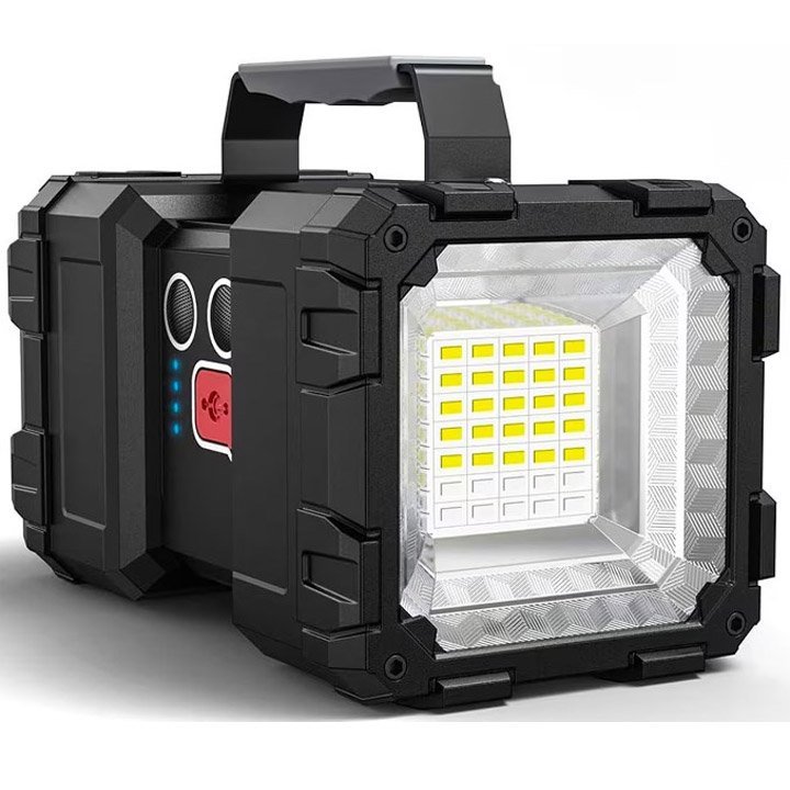 Parametrii tehnici ai produsului: Luminozitate: 800 lm Numar de moduri de iluminare: 7 Numar de diode: 1x XM-L2, 35x SMD alb, 5x SMD albastru, 5x SMD rosu Raza de actiune: pana la 800 m Alimentare: baterie de 10 Ah Timp de lucru: reflector 10-20h / reflector larg 5-12h Material: plastic ABS Dimensiuni: 18x10x13 cm Functia Powerbank Cablu de incarcare USB inclus Lamapa solara functioneaza pe toate tipurile de vreme. Atat panoul cat si sursele de lumina sunt rezistente la ploaie, ninsoare si temperaturi extreme. Lanterna de mare putere cu functie powerbank. Dispozitivul este perfect pentru iluminarea zonelor de camping sau pentru urgente. Lumina de urgenta rosie/ albastra – In cazul in care aveti nevoie de ajutor in timpul unei aventuri in aer liber, aceasta lanterna multifunctionala are o functie speciala de iluminare in caz de urgenta. Lumina stroboscopica rosie si albastra asigura observarea semnalului de la distanta de catre alte persoane. Aceasta lanterna cu LED-uri reincarcabila ofera 3+4 moduri de iluminare, astfel incat ambele capete pot comuta cu usurinta intre cele trei moduri de luminozitate slaba-mediu-forte cu un singur clic. In plus, lumina de urgenta, luminile stroboscopice rosii / albastre si modul SOS pot fi folosite pentru ajutor in aer liber. Cu o luminozitate de pana la 800 lm, aceasta lanterna reincarcabila este potrivita pentru camping, explorarea drumurilor si munca de noapte. Este echipata cu baterii care asigura pana la 10-20 de ore de utilizare, astfel incat va puteti bucura de o noapte in aer liber fara griji. Lanterna va permite sa va incarcati aparatul foto, telefonul, notebook-ul si alte dispozitive in timp ce sunteti in miscare.