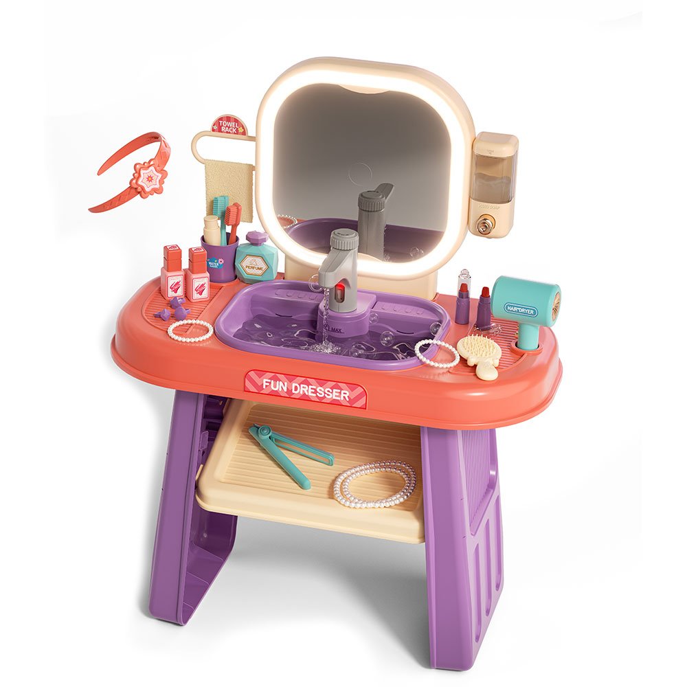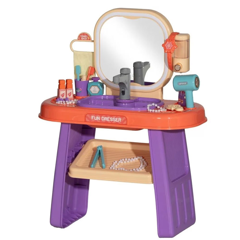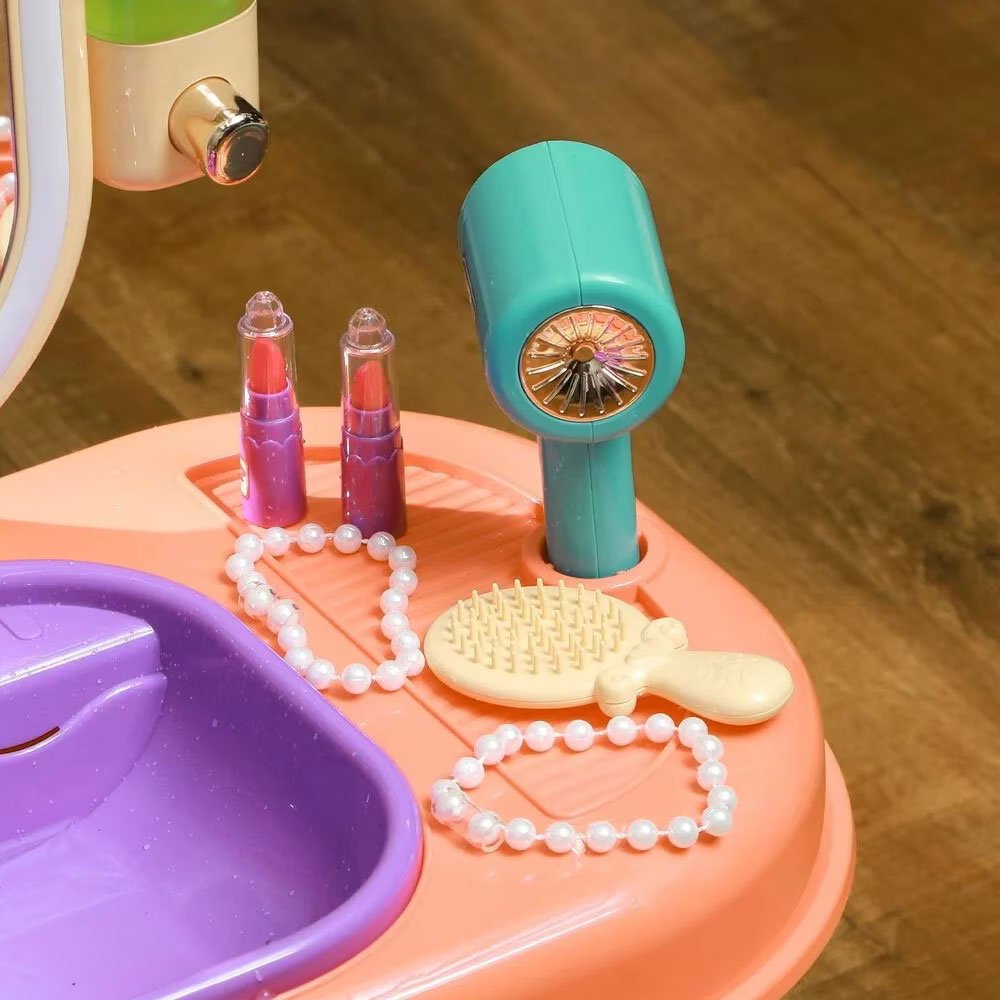 Masuta de Machiaj jucarie Rovo 959, Oglinda cu Lumini LED si Muzica, Robinet cu senzor, Dispenser Sapun, 23 piese