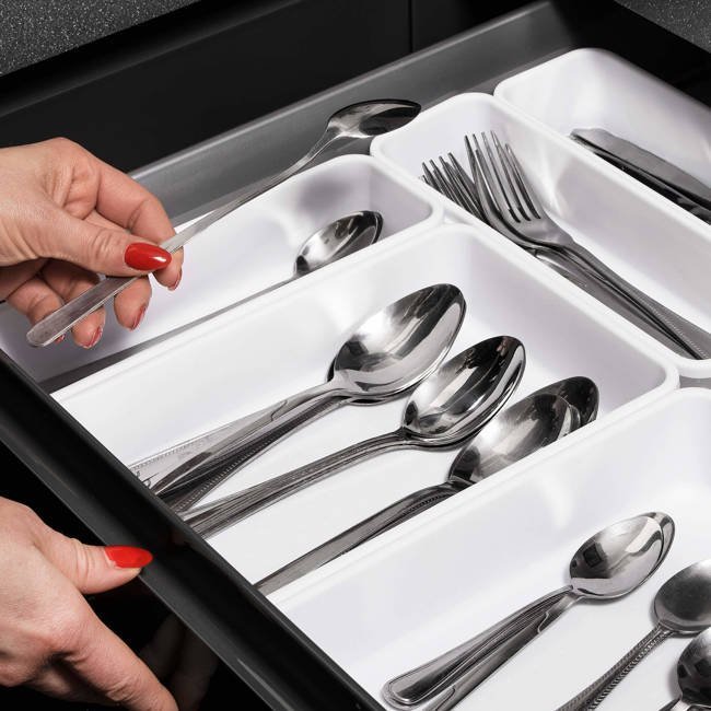 Specification: Organizator sertar bucatarie, 8 piese interconectabile, alb