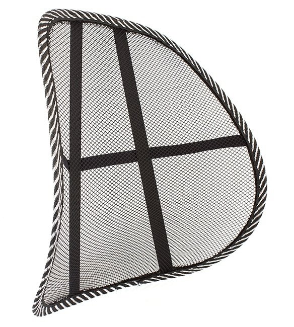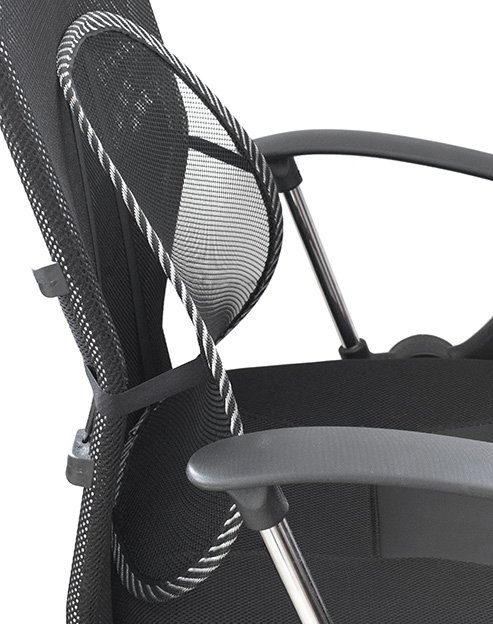 Perna din spate, zona lombară din plasă fină. Asigură poziționarea corectă a coloanei vertebrale în timpul șederii prelungite în poziție așezată. Crește semnificativ confortul de a sta la serviciu.