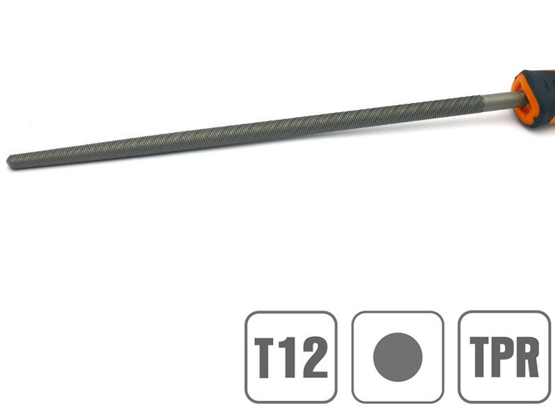 Pila rotunda cu o lungime totalade 200 mm cu o rugozitate de nr.2 (grosieramedie) cu un maner ergonomic, moale, din cauciuc termoplastic (TPR).