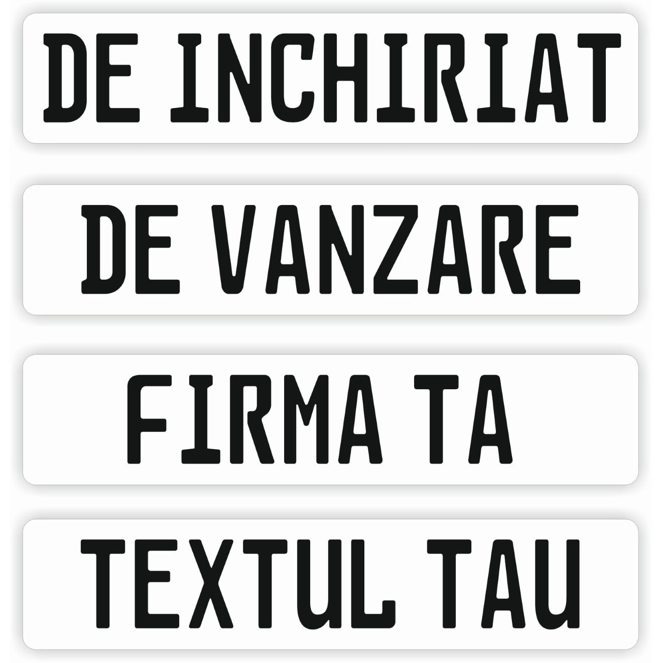 Specification: Placuta de inmatriculare „CUSTOM TEXT”, dimensiune 52 x 11 cm, culoare alba, material PVC, 33 de caractere incluse