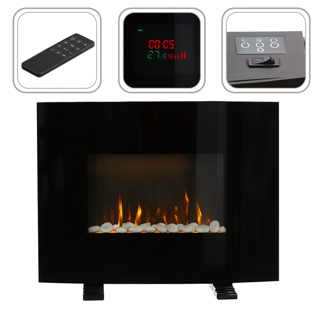 Specificatii tehnice Culoare: negru Dimensiuni: 61 x 13.5 x 48 cm Tip montaj: pe perete sau pe podea Panou frontal: curbat Control: telecomanda + buton tactil Efect flacara: ajustabil, independent de incalzire Putere incalzire: 1000W / 2000W Alimentare: 220–240V, 50 Hz Moduri funcționare: ventilator + 2 trepte de incalzire Siguranta: protectie termica la supraincalzire Scurta descriere Semineu electric modern, cu panou curbat si efect realist de flacara. Poate fi montat pe perete sau asezat pe podea, adaptandu-se oricarui spatiu. Atmosfera calda si placuta, cu sau fara incalzire. Caracteristici principale Design modern cu panou curbat Efect de flacara ajustabil Flacara functioneaza independent de caldura Control prin telecomanda Doua trepte de incalzire Montaj versatil pe perete sau podea Protectie la supraincalzire