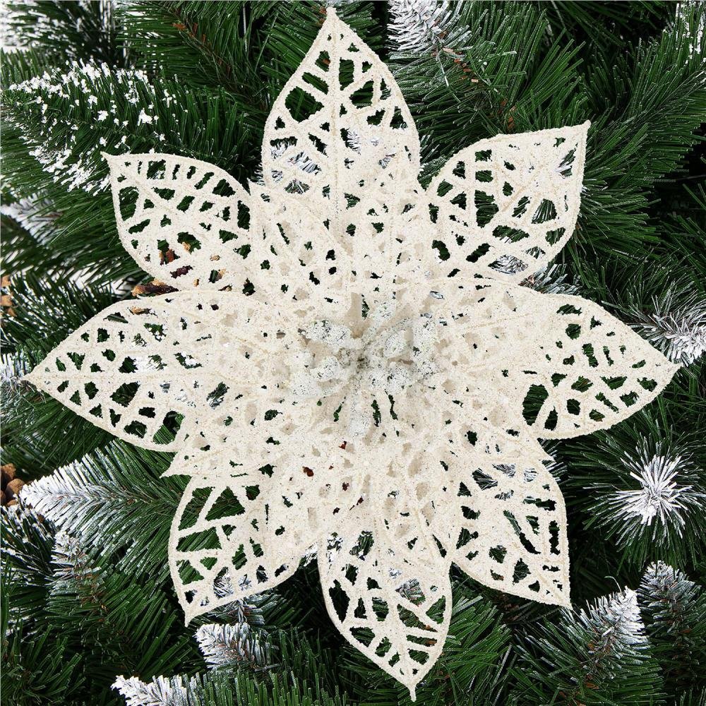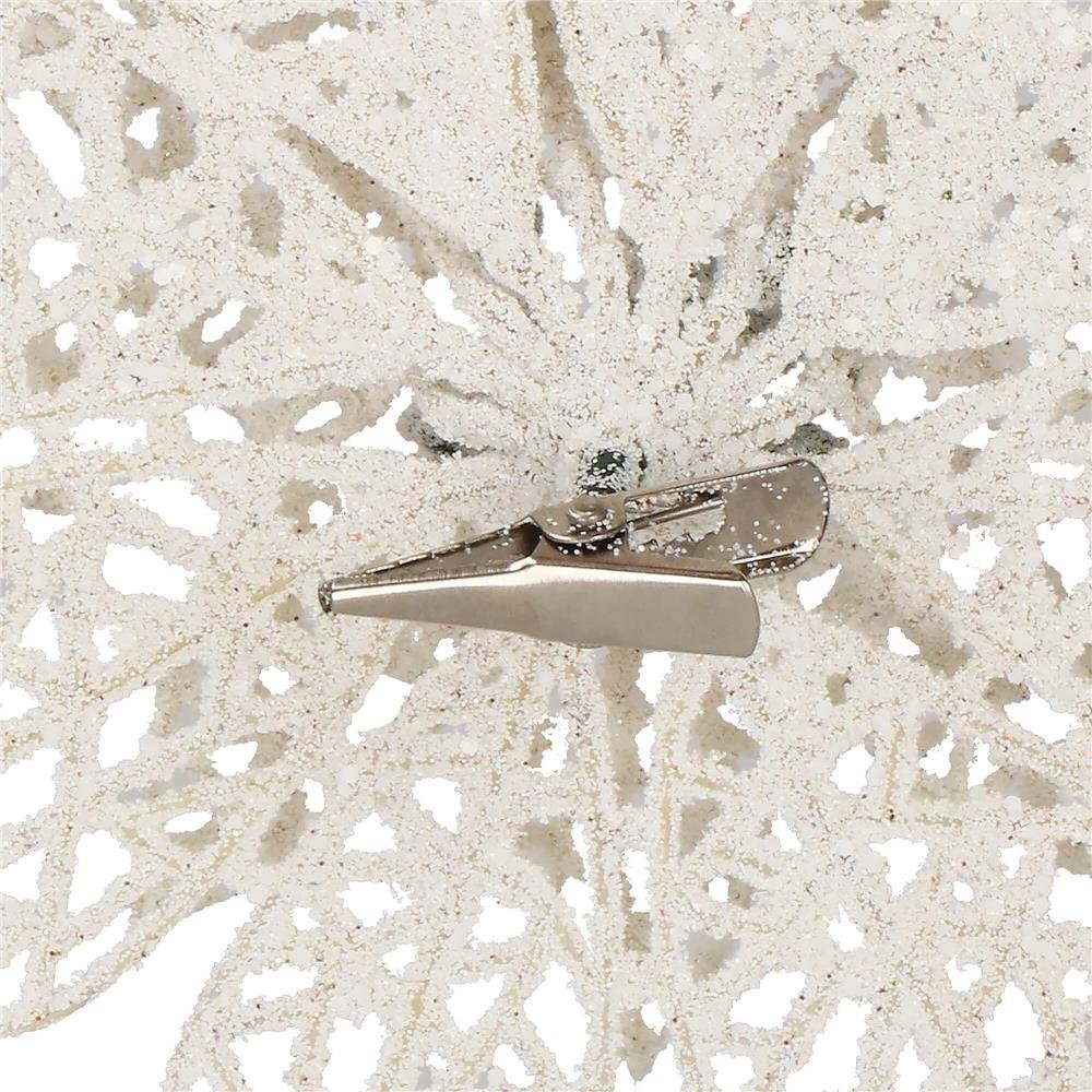 Set 10 ornamente pentru bradul de Craciun, stea Poinsettia, 14cm, alb cu sclipici