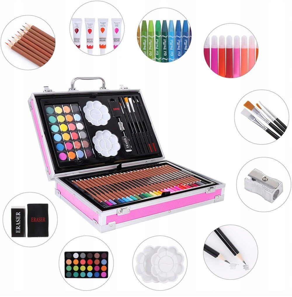 Specification: Set 145 piese pentru pictura, pentru copii sau adulti, pixuri de colorat, creioane colorate si vopsele de pictura, cu geanta de transport ROZ, model AVX-WT-BLAKE145