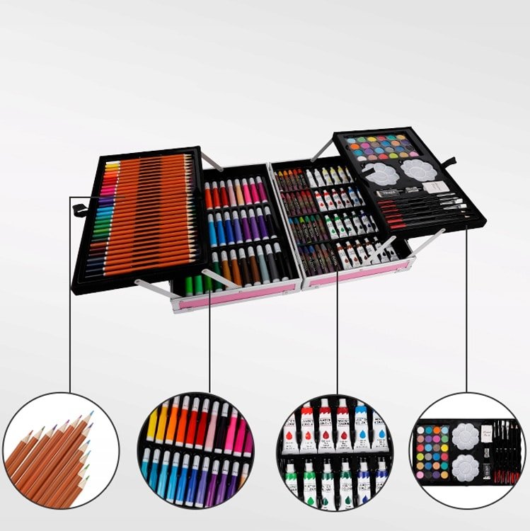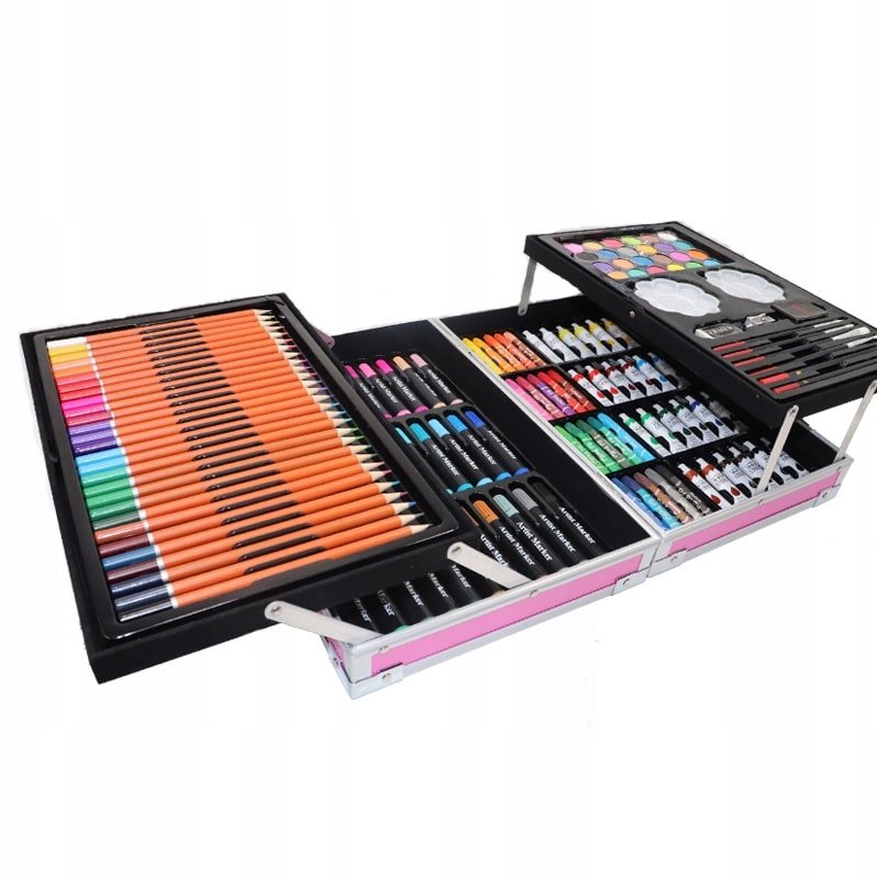Setul nostru de artă are câte ceva pentru toată lumea – pixuri de colorat , creioane colorate și vopsele de pictură . Toate acestea în culori saturate care arată grozav pe hârtie. Totul este închis într-o valiză confortabilă care poate fi ușor pliată, închisă și luată cu tine – la școală , grădiniță, cursuri de artă sau într- o excursie pentru a picta în aer liber!