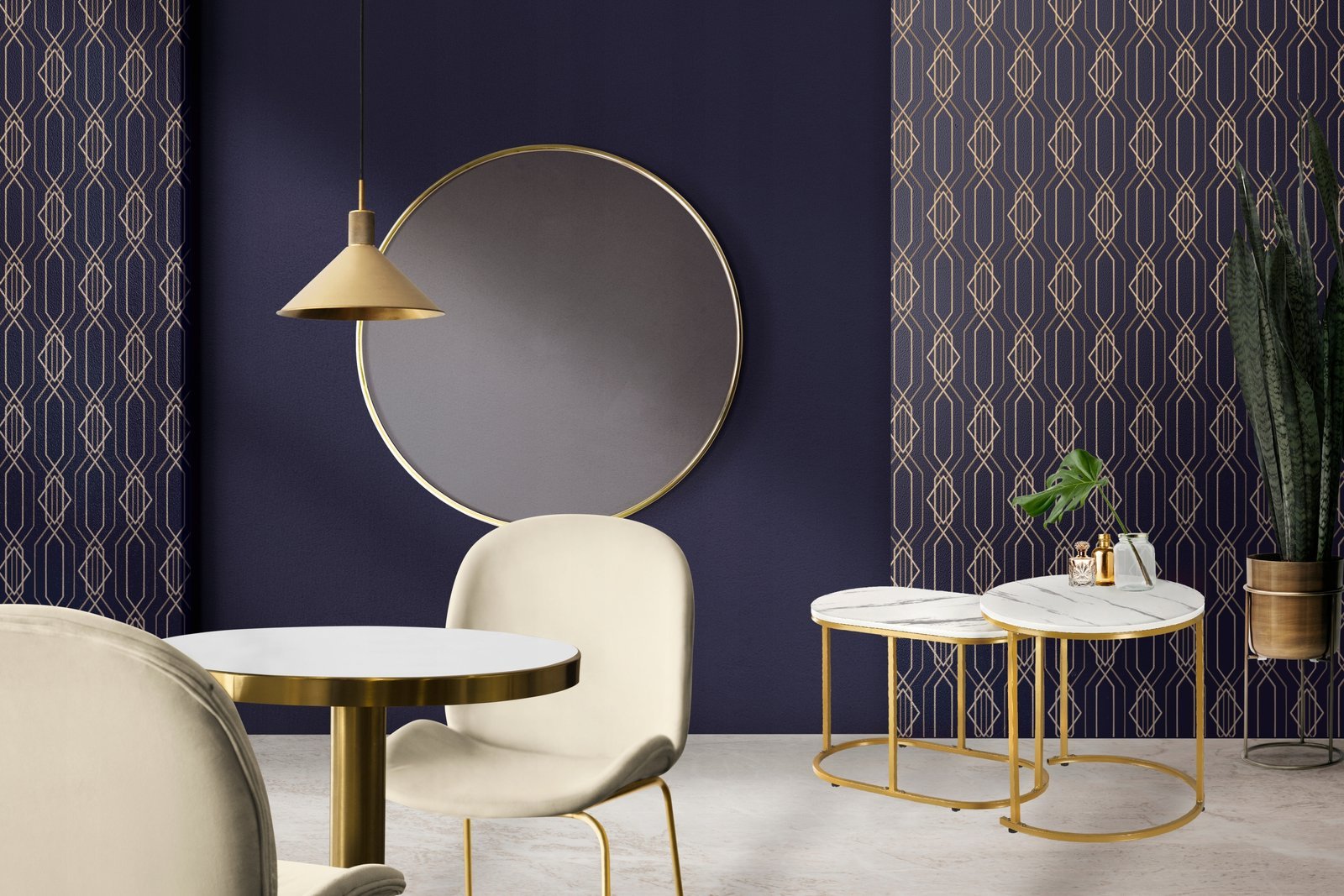 Set 2 mese pentru cafea, cadru otel, blat MDF model marmura, 50x50x50 cm si 60x32x44 cm, alb si auriu