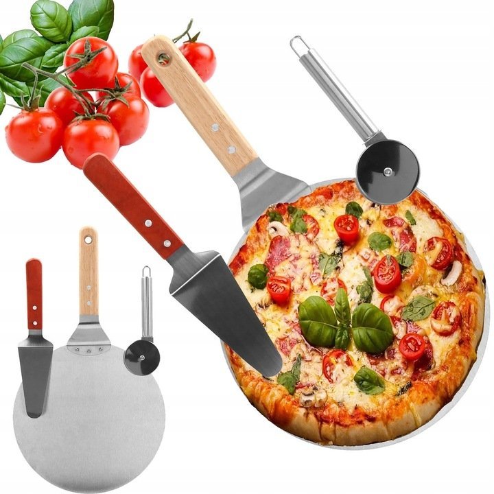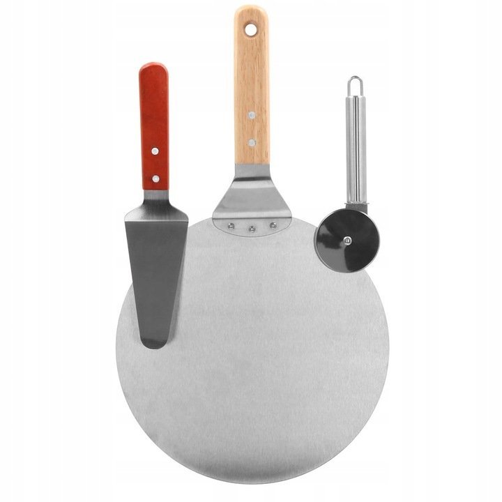 Specification: Set 3 accesorii pentru pizza, tava, spatula si taietor, inox cu manere din lemn