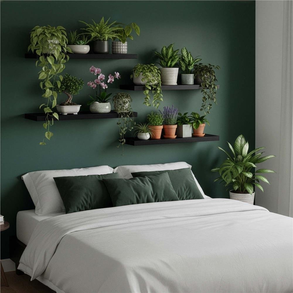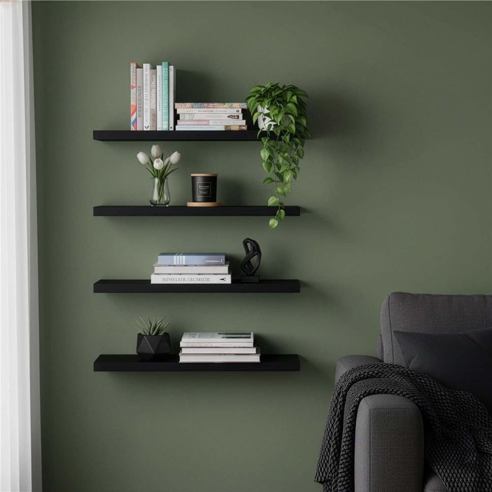 Be the first to review “Set 4 rafturi supendate de perete, MDF cu suport metalic ingropat, 40×15 cm, negru”