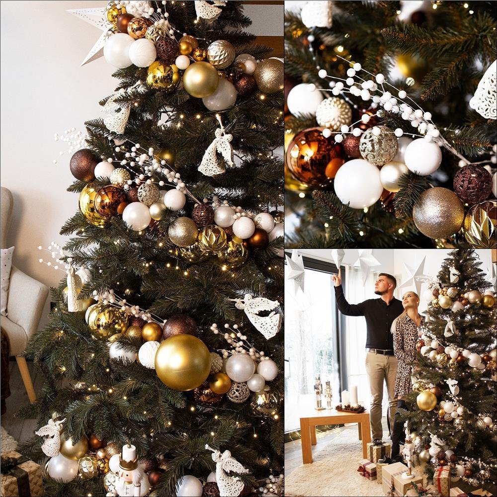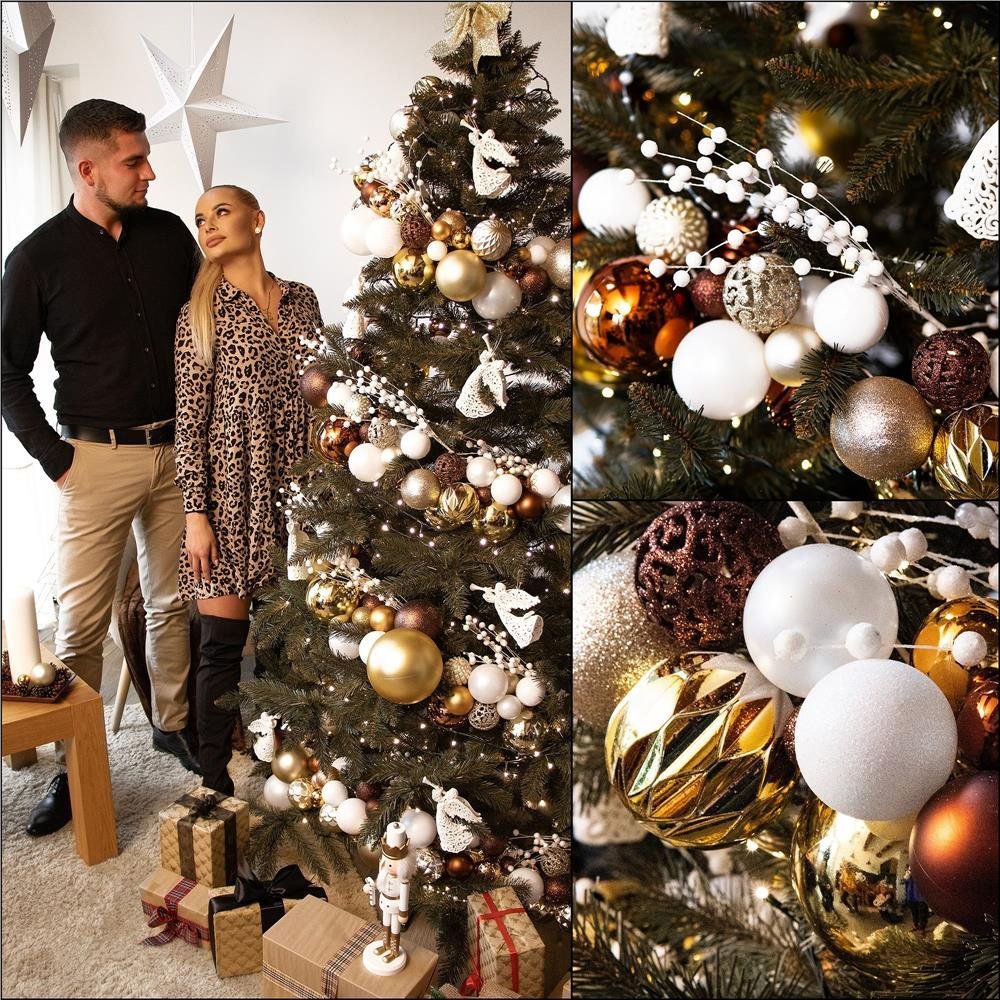 Specification: Set globuri brad si varf stea, 101 piese, plastic, 3–7 cm, maro si rose gold