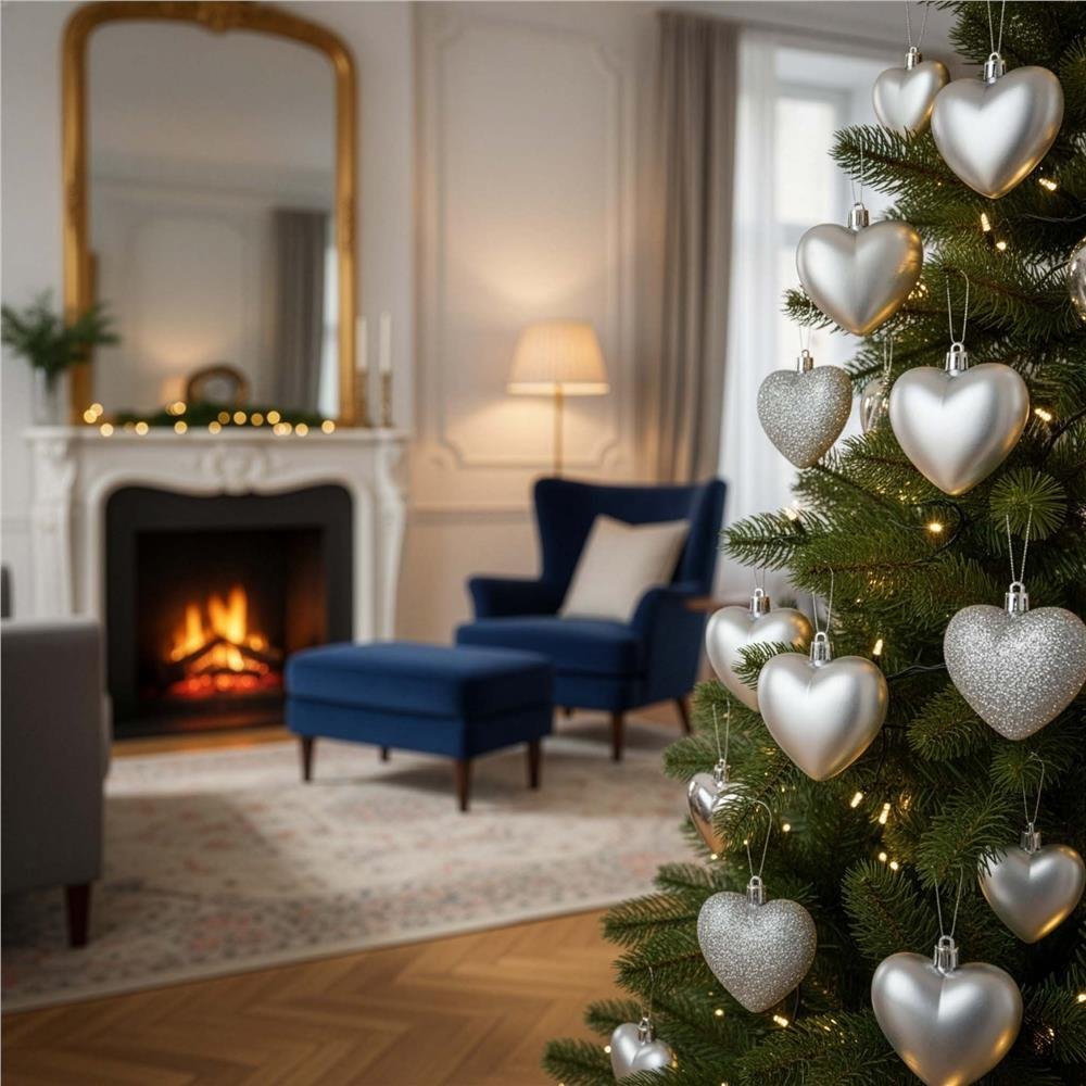 Specification: Set globuri decorative in forma de inima, 16 bucati, plastic, 4-7 cm, argintiu