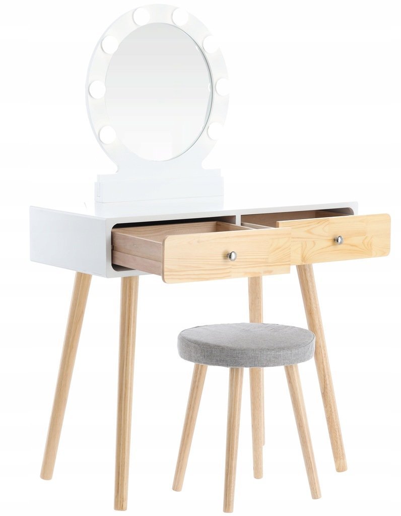 Set masa de toaleta si machiaj cu taburet, Scandinav, oglinda, iluminare LED, 75x45x130 cm, alba