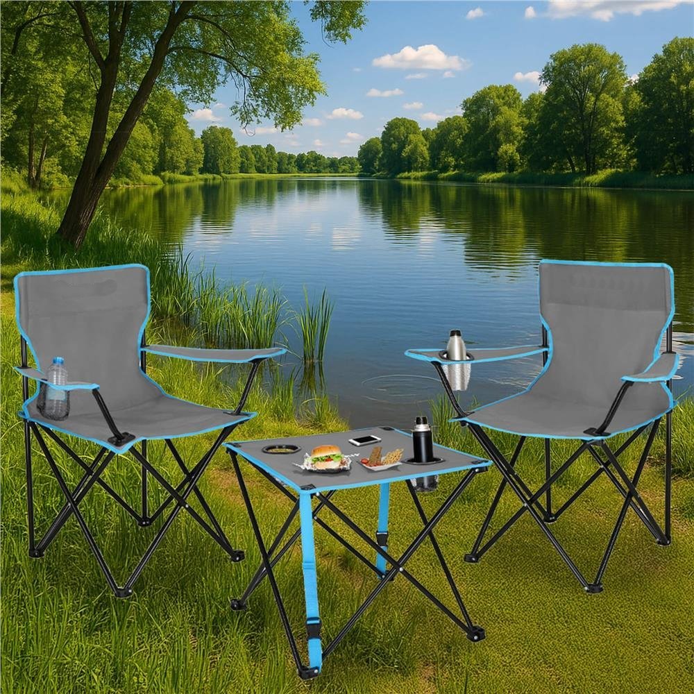 Specificatii tehnice: Tip produs: Set masa si scaune pliante Componente incluse: Masa + 2 scaune + husa de transport Material cadru: Metal Material textil: Poliester Dimensiuni masa: 47x47x45 cm Dimensiuni scaun: 76x80x41 cm Greutate suportata masa: 20 kg Greutate suportata scaun: 120 kg Accesorii: Suporturi pentru bauturi, husa cu maner Culoare: Gri, negru, albastru Scurta descriere: Acest set pliabil cu masa si doua scaune este solutia ideala pentru excursii, camping sau momente relaxante pe balcon. Designul usor si compact permite transportul facil si depozitarea fara efort. Cu structura metalica rezistenta si material textil durabil, ofera confort si stabilitate in orice context outdoor. Caracteristici principale: Constructie pliabila pentru transport usor Include masa, 2 scaune si husa cu fermoar Buzunare pentru bauturi integrate in masa si scaune Gauri pentru fixare in sol in zone cu teren instabil Potrivit pentru picnic, pescuit, terasa, gradina sau festivaluri Scaune cu cotiere si spatar inalt pentru confort sporit Material textil rezistent la uzura si umiditate Design versatil si culori neutre