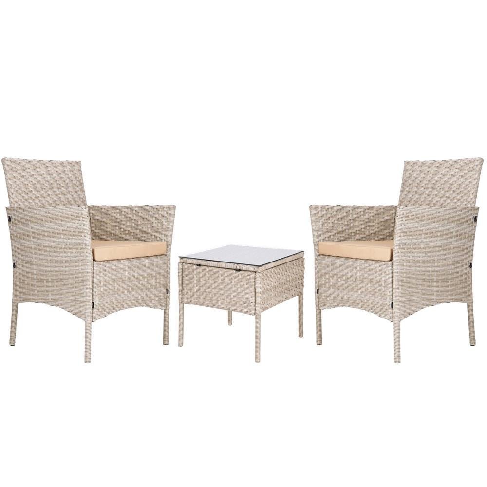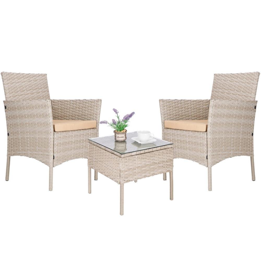 Specification: Set mobilier terasa, din tehnorattan, masa cu blat sticla securizata, 2 fotolii cu perne, bej