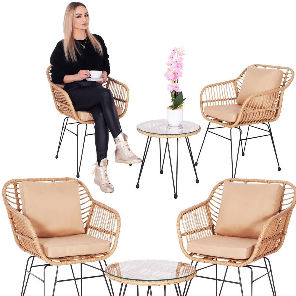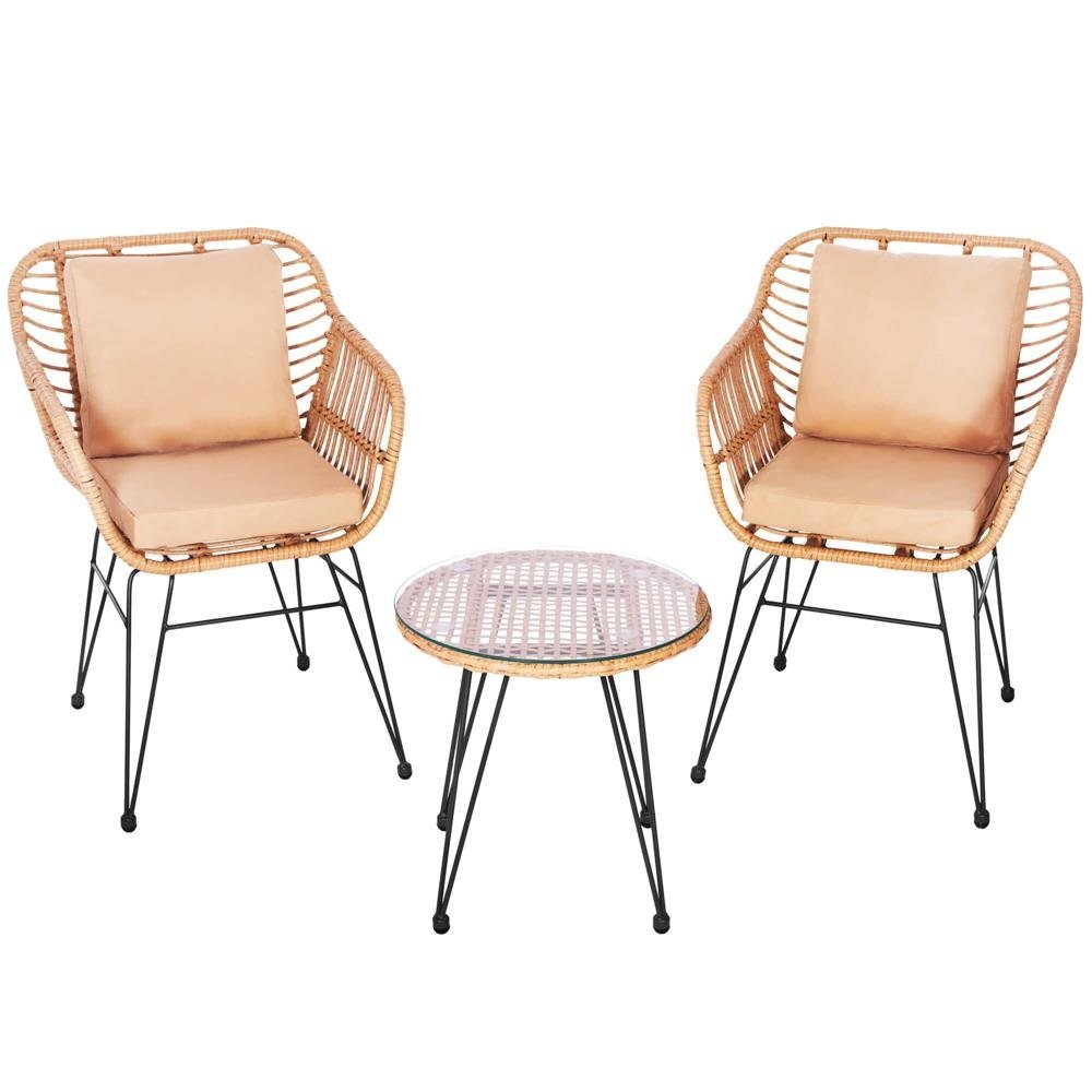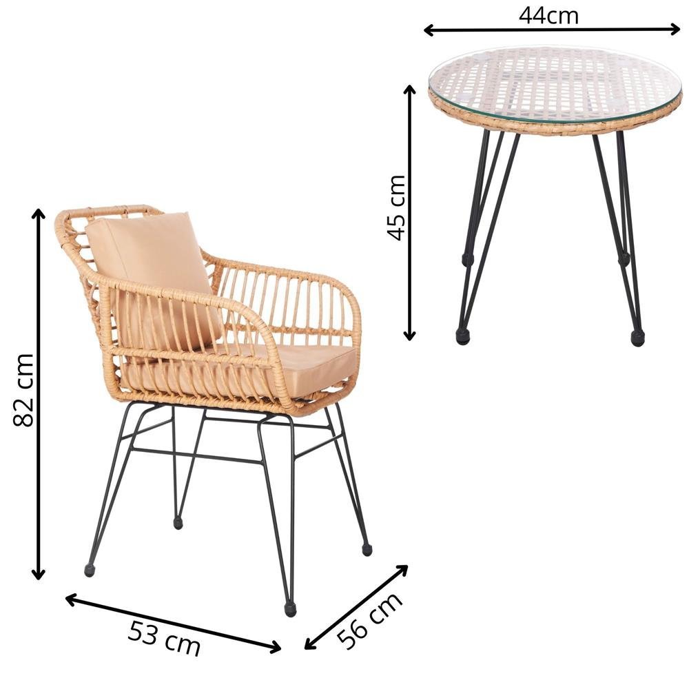 Culoare: nuante de bej/maro; Material: tehnorattan, sticla calita, metal, poliester/spuma PP Produse pentru auto-asamblare – instructiuni incluse Scaun: 82 x 56 x 53 cm Diametru blat: 44 cm Inaltimea totala a mesei: 45 cm Mobilierul nostru de gradina este fabricat din materiale de cea mai buna calitate, ceea ce garanteaza durabilitatea si longevitatea lor. Datorita acestui fapt, ele sunt rezistente la lumina soarelui, la ploaie si la schimbarile de temperatura, ceea ce inseamna ca va pot servi timp de mai multe sezoane, pastrandu-si valorile estetice. Mobilierul nostru de gradina nu este doar practic si functional, ci si extrem de elegant. Designul lor este atent gandit, iar liniile si formele sunt in concordanta cu cele mai recente tendinte din industria mobilierului de gradina. Datorita lor, gradina dvs. va capata un nou caracter, devenind un loc care ii va incanta pe toti oaspetii dvs. cu stilul si gustul sau rafinat.