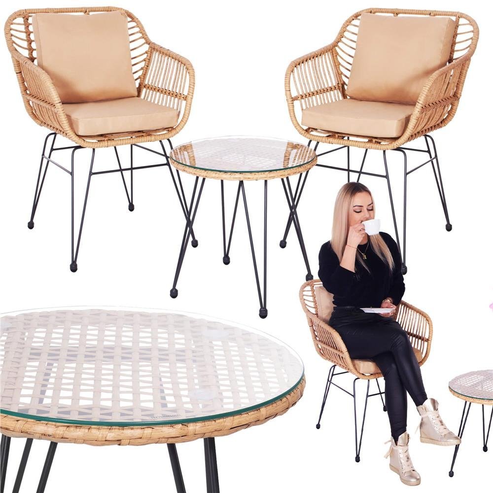 Specification: Set mobilier terasa, din tehnorattan, masa cu blat sticla securizata, 2 fotolii cu perne, maro