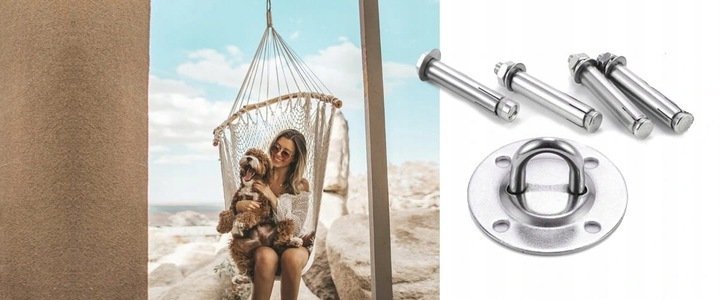 4 suruburi de expansiune pentru lemn 4 suruburi pentru beton Maner metalic cu tepusa Carabina Franghie din polipropilena Folie de protectie pentru suruburi Carlig cu sistem de prindere rapida Incuietoare anti-detasare Capacitate maxima de incarcare: pana la 200 kg Constructie solida, realizata din metal rezistent Lungimea cablului: 2 metri Reglabil in mod liber Asamblare simpla Set de montare universal pentru fixarea hamacelor, sezlongurilor, balansoarelor, a sacilor de box, a benzilor de exercitii si a multor alte dispozitive. Asigura o fixare stabila si astfel – siguranta in timpul utilizarii. Dispune de doua tipuri de suruburi – pentru suprafete de beton si de lemn, astfel incat sa puteti monta echipamentul dumneavoastra oriunde doriti! Setul este fabricat din metal solid si durabil. Carligul este echipat cu un sistem de eliberare rapida si un sistem de blocare impotriva detasarii bruste. Franghia solida din polipropilena va asigura o fixare ferma si, cu lungimea sa de 2 m, permite reglarea libera.