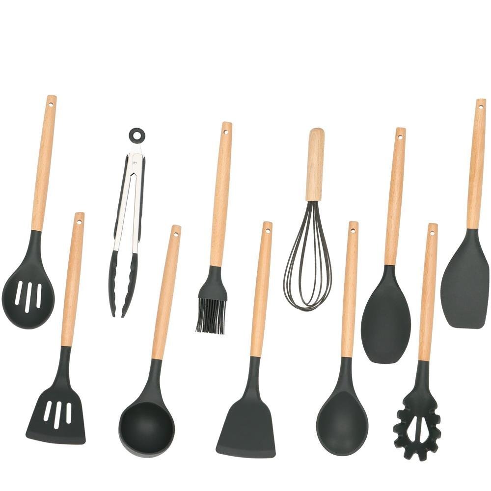 Set Sersimo 12 ustensile de bucatarie din silicon termorezistent si maner din bambus, gri