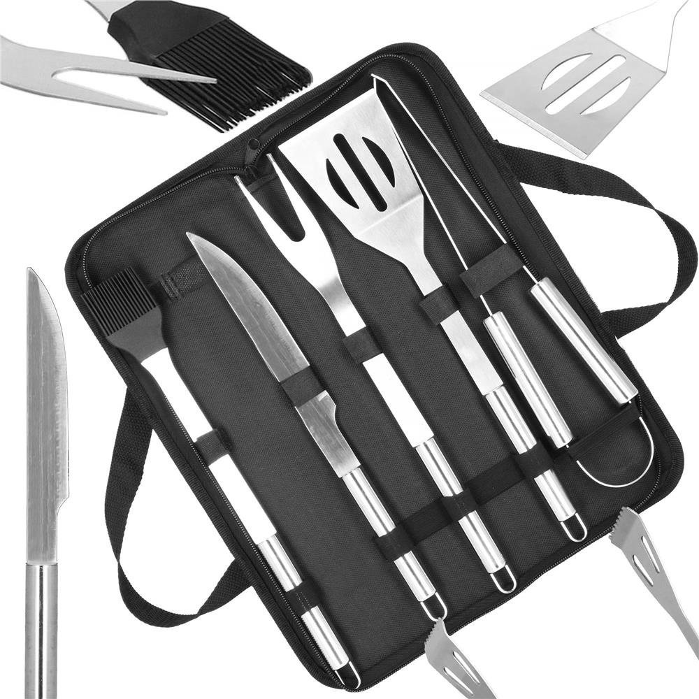 Set ustensile gratar 5 piese, inox, cu husa transport, 37x14x5 cm, argintiu
