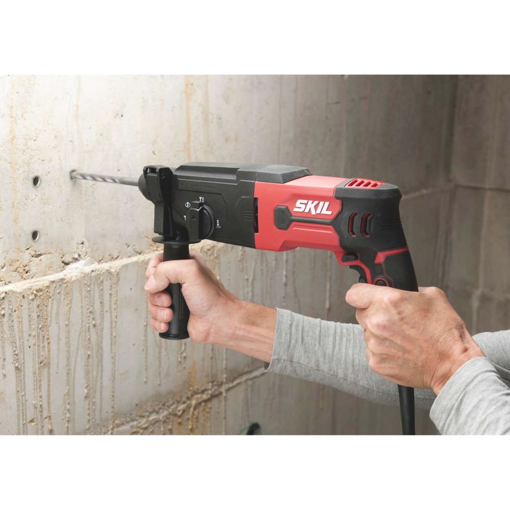 Rotopercutorul SKIL 1770 cu patru funcţii are un motor puternic de 850 W şi preselectorul variabil de turaţie şi buton de blocare pentru control optim la lucrările de găurire a betonului cu diametre de până la 26 mm. Este echipat cu un mecanism de percuţie puternic, pentru găurirea în beton, o oprire a percuţiei, pentru găurire şi înşurubare obişnuită şi o oprire a rotaţiei, pentru lucrările de dăltuire uşoară. Ca ultimă, dar nu mai puţin importantă funcţie, cu această maşină de găurit este posibilă dăltuirea cu rotaţie liberă. Sistemul „SDS+“ facilitează schimbarea rapidă şi simplă a accesoriilor. Puteţi utiliza comutatorul de avans/retragere pentru a schimba comod sensul de lucru al uneltei. Mânerul moale, protejat împotriva alunecării, precum şi mânerul lateral reglabil, asigură controlul confortabil, cu ambele mâini. Cu ajutorul sistemului practic de reglare a adâncimii puteţi preselecta adâncimea găurilor înfundate. Maşina de găurit SKIL 1770 se livrează într-o geantă robustă, împreună cu un set de trei burghie „SDS+“ pentru beton, de 6, 8 şi 10 mm şi o mandrină de 13 mm cu adaptor „SDS+“.