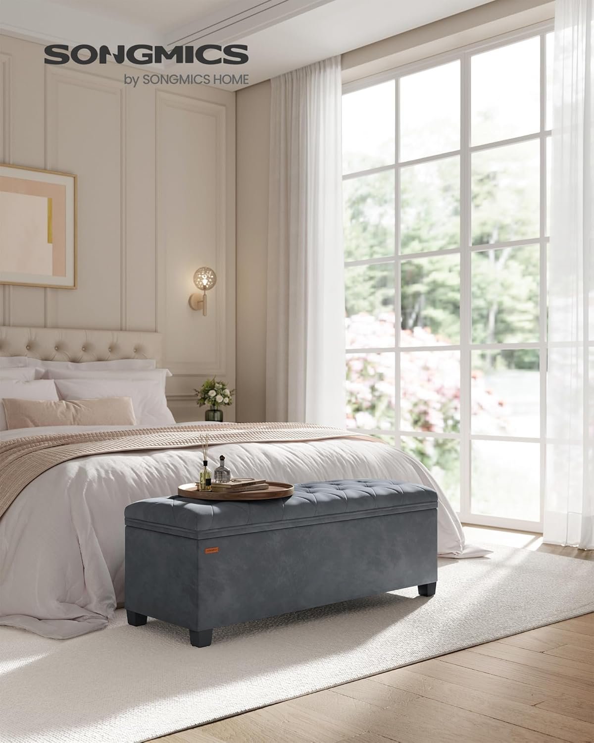 SONGMICS Banca cu spatiu de depozitare 110x40x40 cm, 103 litri, tapitata cu catifea, MDF si spuma, gri
