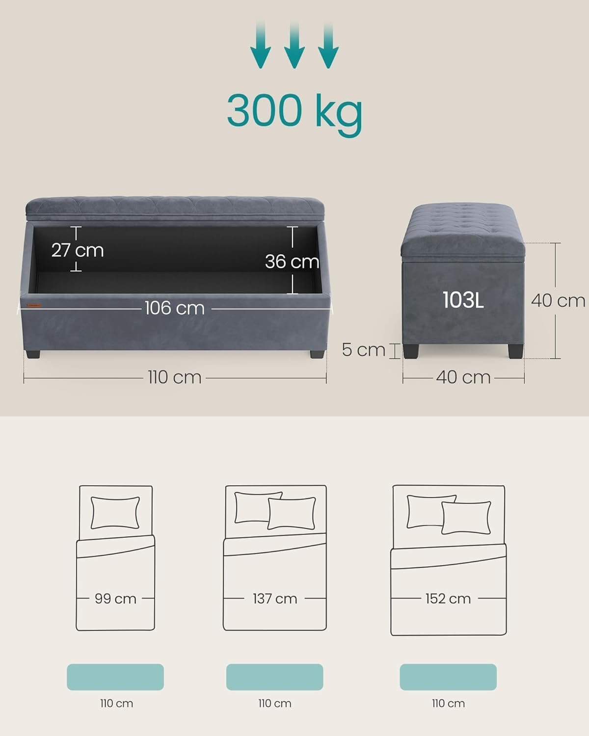 Specification: SONGMICS Banca cu spatiu de depozitare 110x40x40 cm, 103 litri, tapitata cu catifea, MDF si spuma, gri
