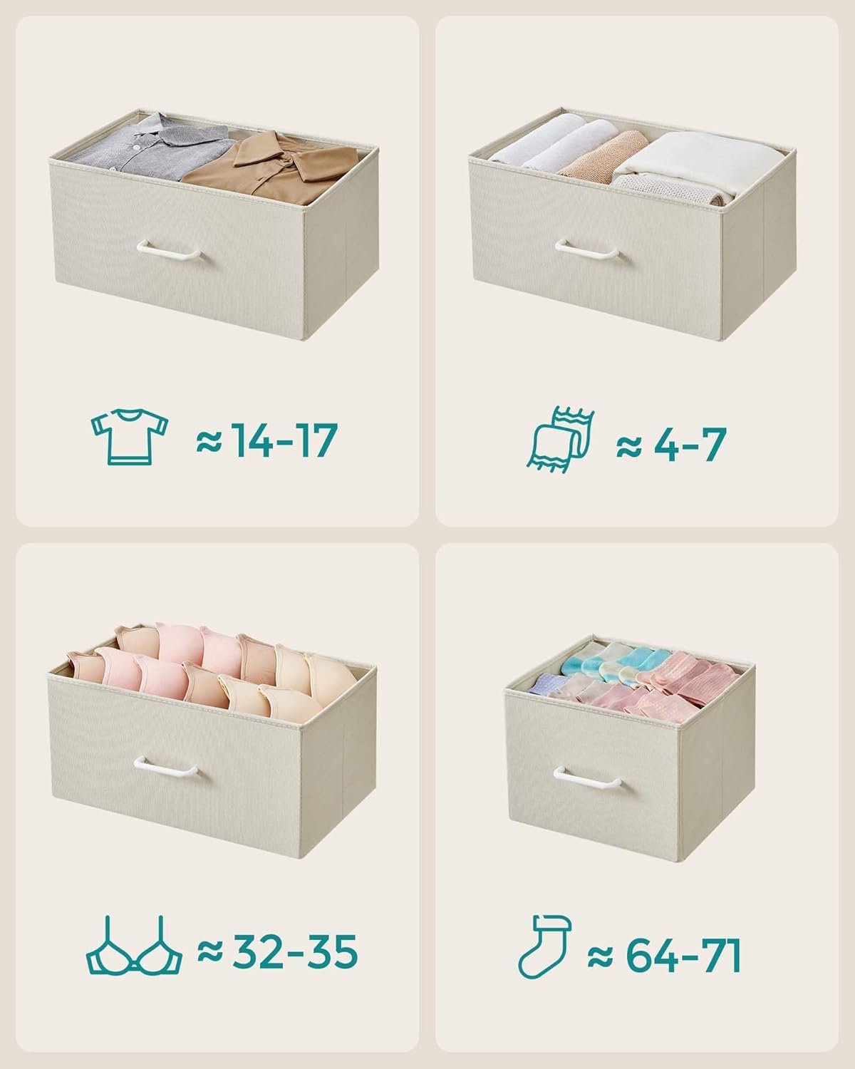 Specificatii tehnice Tip produs: Comoda cu sertare Material: PAL, metal, sertare textile Cadru: Otel Culoare: Alb crem/alb Numar sertare: 7 Dimensiuni: 98x29x85 cm Capacitate maxima pe sertar: 3 kg Capacitate maxima blat: 50 kg Capacitate maxima totala: 71 kg Scurta descriere Comoda SONGMICS cu 7 sertare textile ofera o solutie practica pentru organizarea eficienta a hainelor si accesoriilor. Structura metalica stabila si blatul din PAL permit utilizarea in dormitor, living sau dressing. Sertarele textile sunt usoare si ideale pentru depozitare zilnica, iar designul industrial se integreaza usor in interioare moderne. Caracteristici principale Sapte sertare pentru organizare clara si eficienta Structura stabila cu cadru metalic Sertare textile usoare, potrivite pentru haine si accesorii Blat solid din PAL pentru obiecte decorative Picioare reglabile pentru stabilitate pe suprafete inegale Sistem de protectie impotriva rasturnarii Montaj usor cu instructiuni incluse