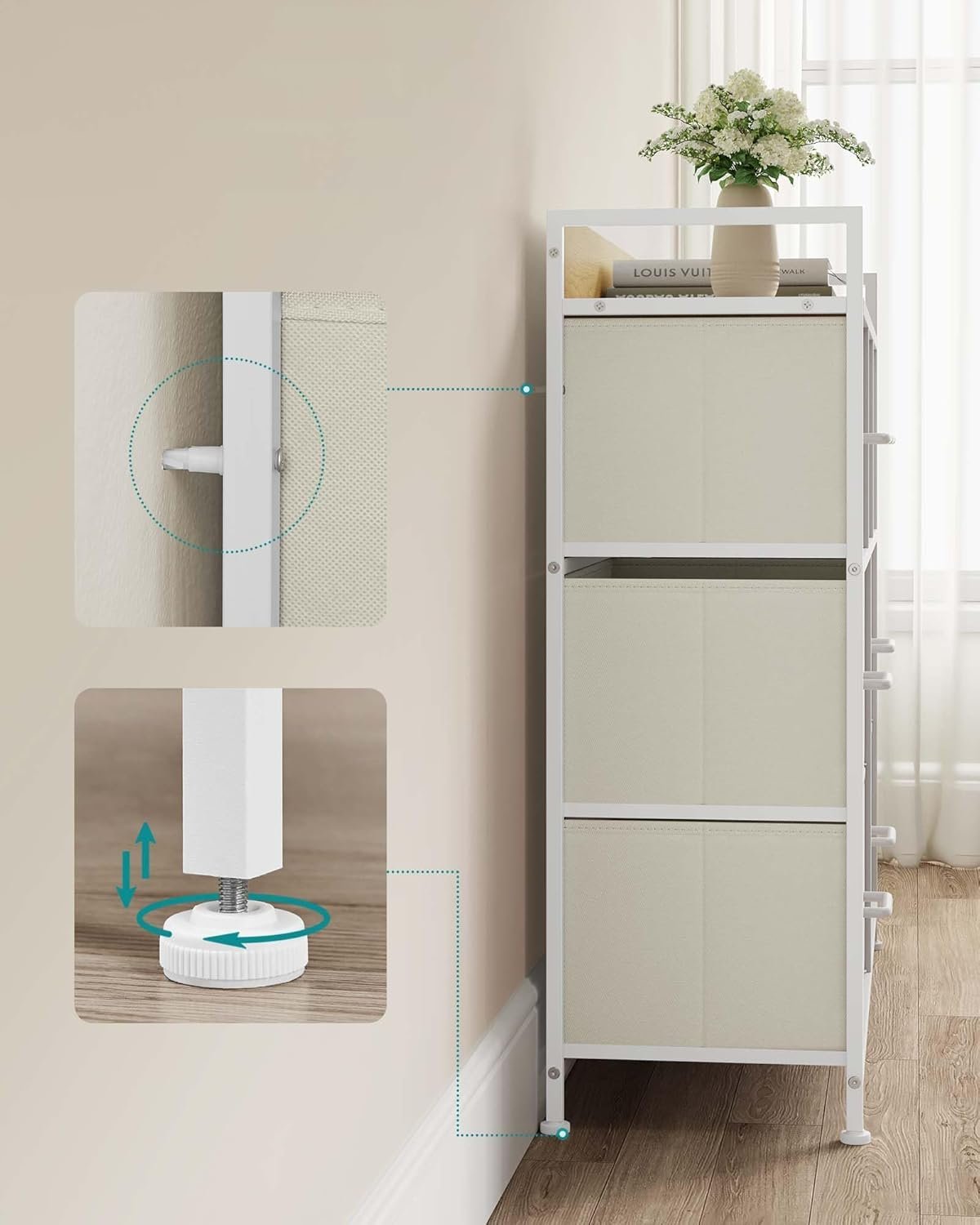 Specification: SONGMICS Comoda cu 7 sertare textile, cadru metalic si blat din PAL, design industrial, 98x29x85 cm, alb crem