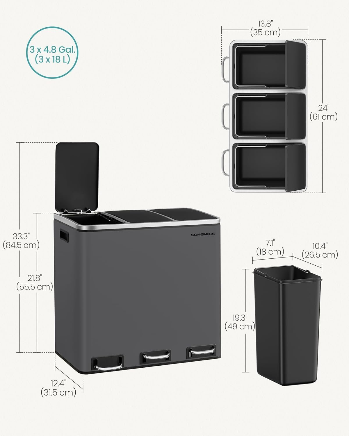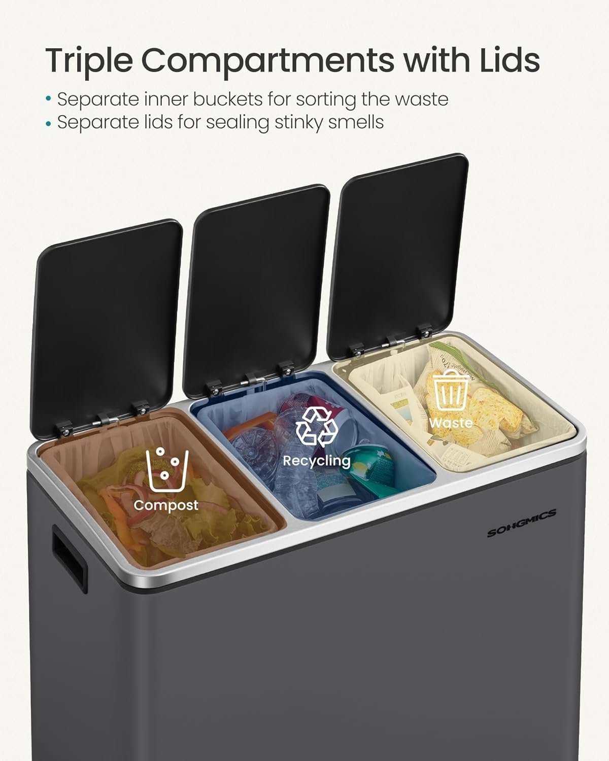 Specification: SONGMICS Cos de gunoi colectare selectiva cu 3 compartimente 3 x 18L, capace soft close, pedale, otel, 61x32x56 cm, gri mat