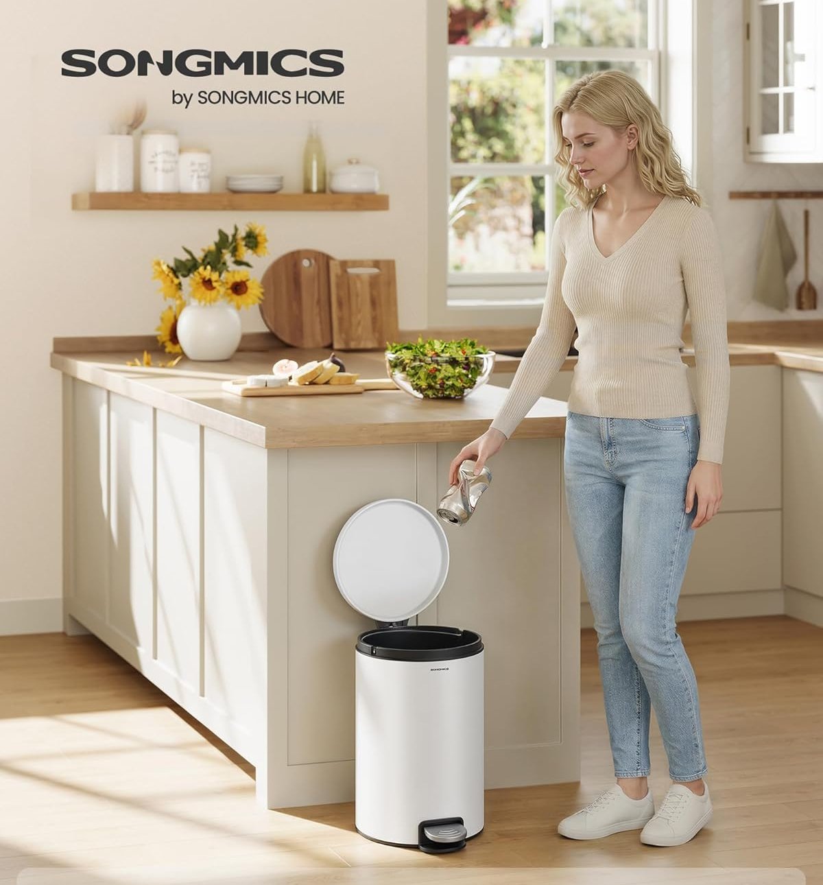 SONGMICS Cos de gunoi cu pedala 20L, capac soft close, galeata interioara detasabila, otel si plastic, 30x37x44 cm, alb