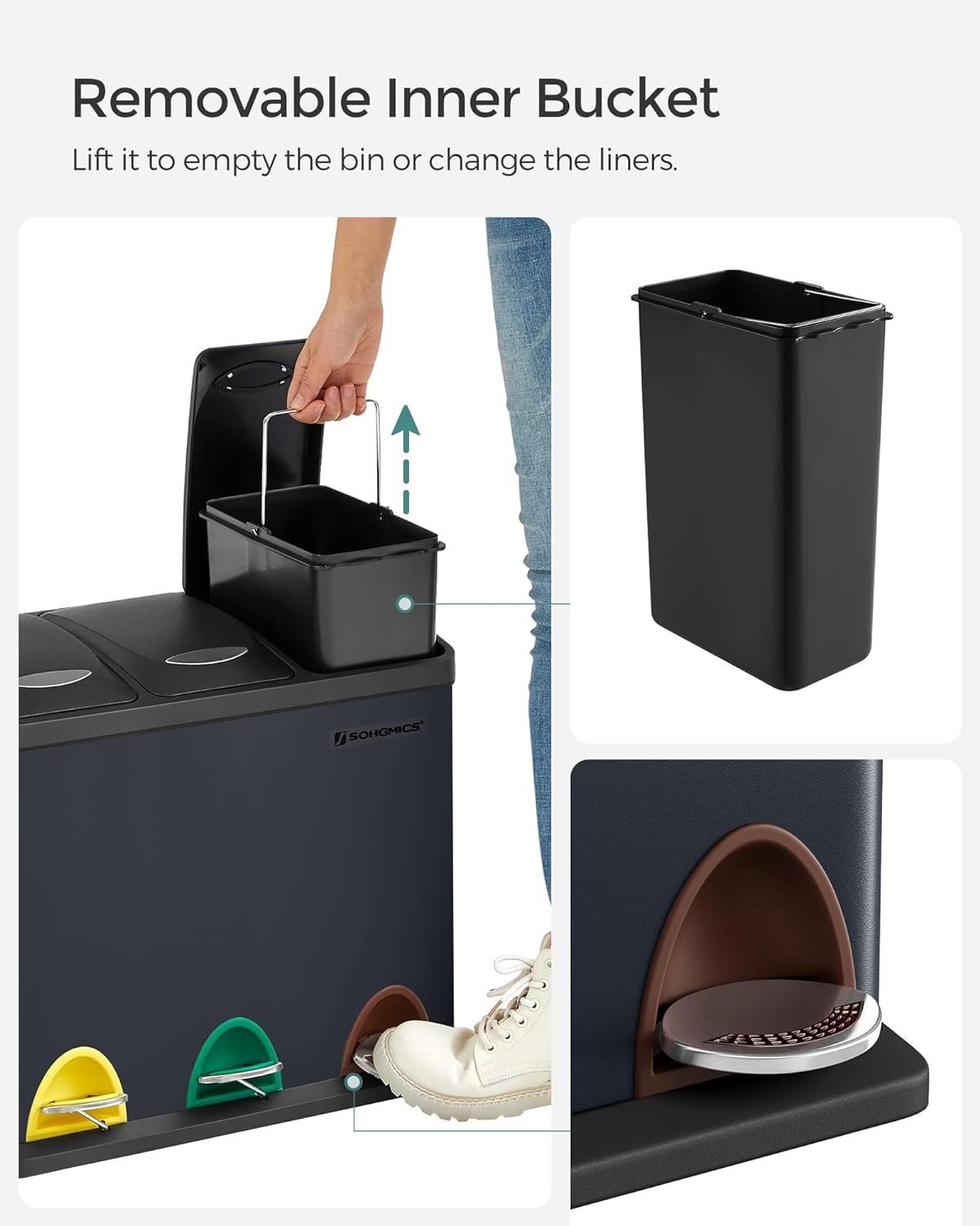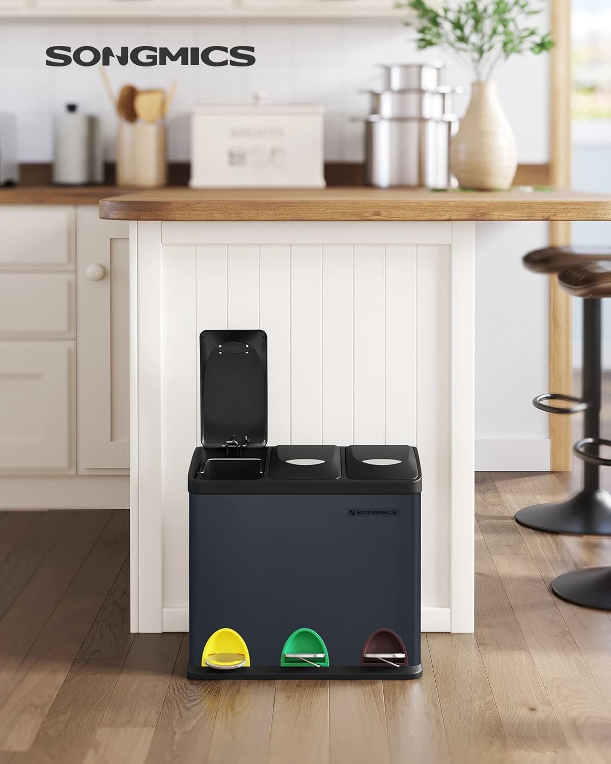 Specification: SONGMICS Cos de gunoi din otel cu 3 compartimente colectare selectiva, cu galeti interioare, 3x8litri, negru