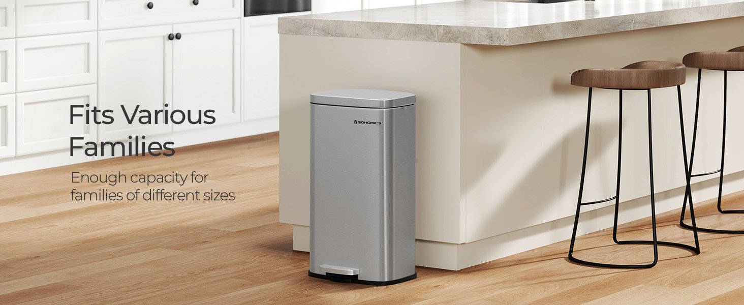 Specification: SONGMICS Cos de gunoi din otel cu pedala, galeata interioara plastic, capac inchidere lenta, 30L, 35x30x63cm, argintiu