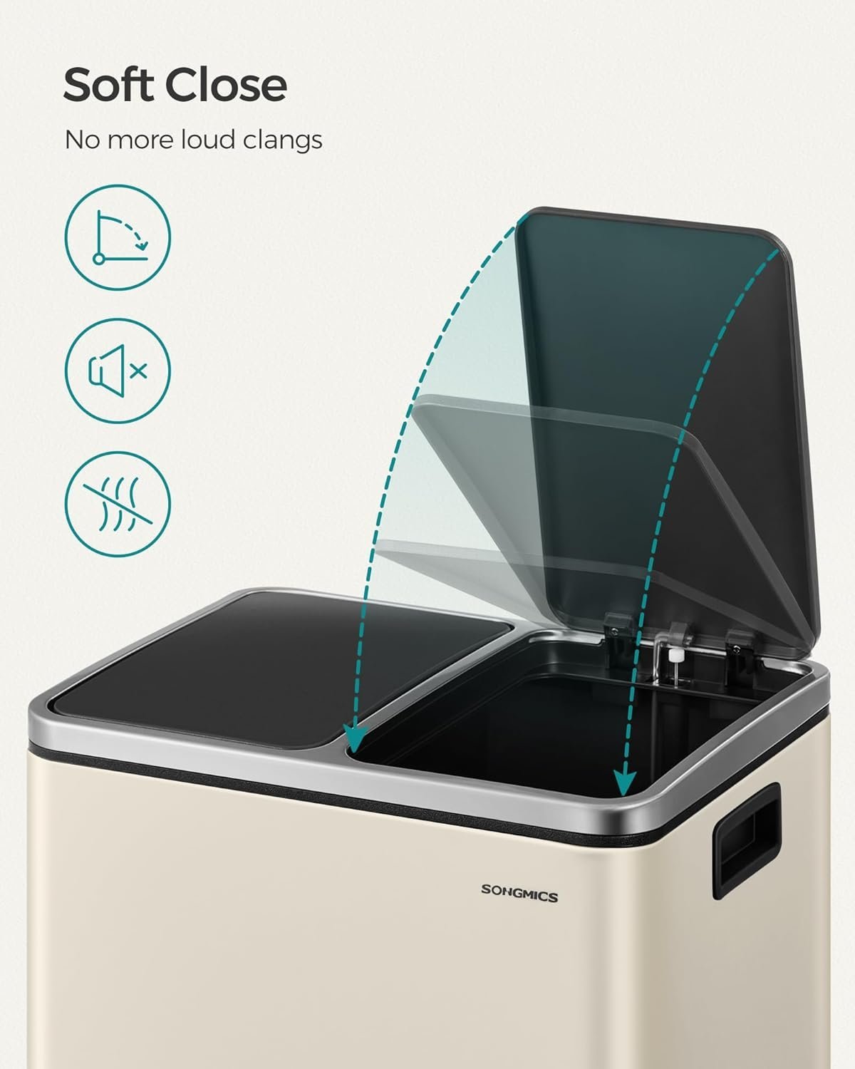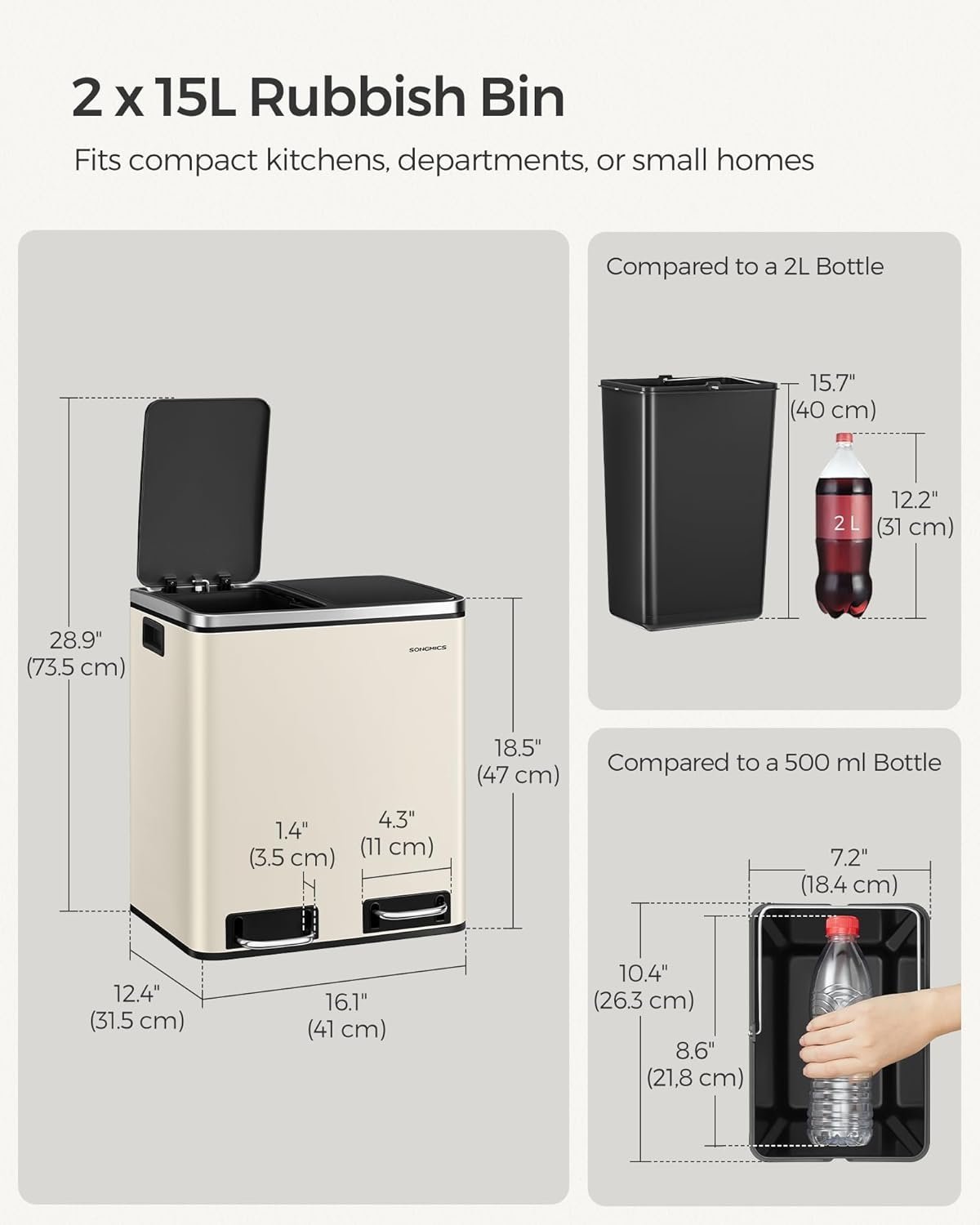 Specification: SONGMICS Cos de gunoi dublu 41x32x47 cm, 2x15L, pedale separate, capac soft-close si galeata detasabila, bej si negru