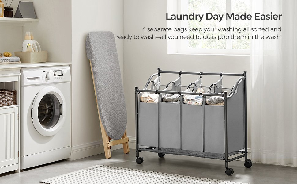 Specification: SONGMICS Cos de rufe cu 4 saci detasabili, structura metalica pe roti, 4x35L, 87x38x81cm, gri