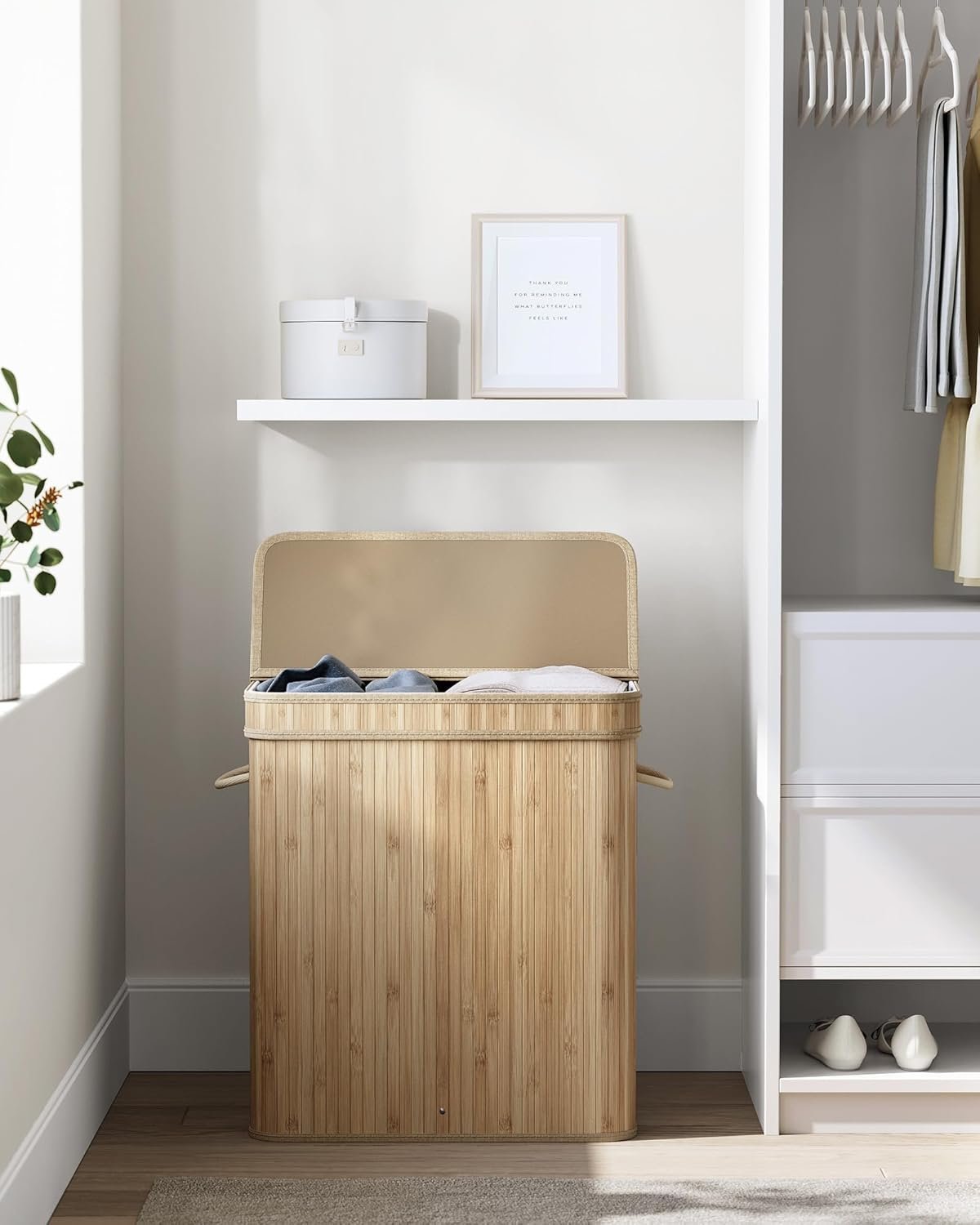 SONGMICS Cos de rufe din bambus cu capac 100L, sac textil detasabil, 55x35x61 cm, bej natur