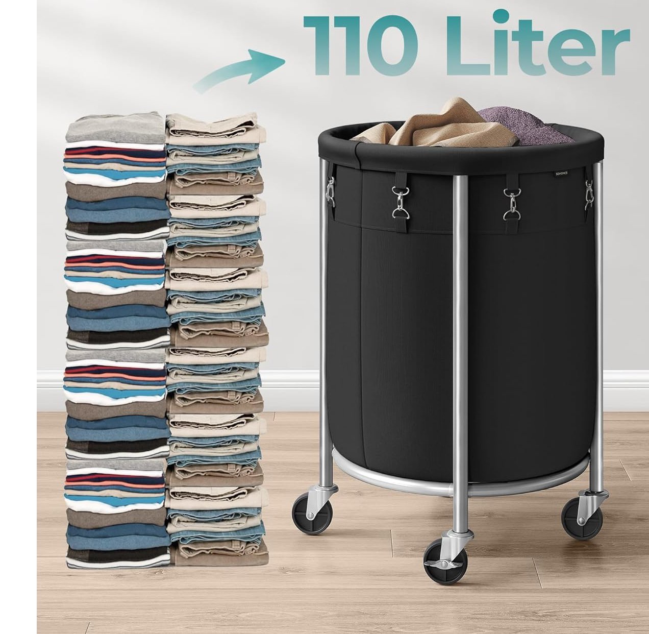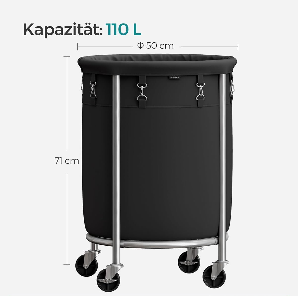 Specification: SONGMICS Cos de rufe rotund cu roti, cadru din otel, sac de rufe detasabil, 110 litri, negru