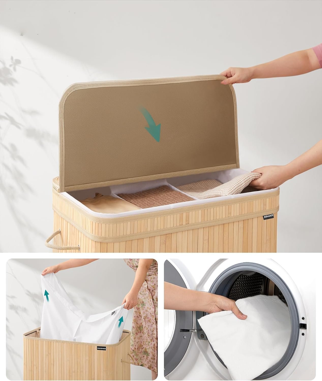 SONGMICS Cos rufe 63x42x61 cm, 150L, pliabil cu capac si sac lavabil, bambus si textil, bej natur