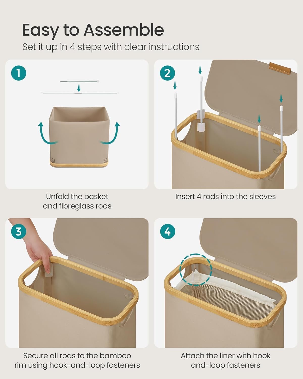 Specificatii tehnice: Brand: SONGMICS Model: LCB506N02 Tip produs: Cos de rufe slim cu capac Capacitate: 65 L Culoare: Maro bej Material: Material Oxford 600D, tije din fibra de sticla, captuseala mesh Dimensiuni: 42 x 22,5 x 70,5 cm (L x l x H) Scurta descriere: Cos de rufe slim, cu o capacitate de 65 L, ideal pentru spatii inguste precum bai mici, garsoniere sau camere compacte. Realizat din material Oxford rezistent la apa si rupere, cu design clasic si nuanta camel brown. Prevazut cu capac pentru discretie si sac interior detasabil ce poate fi folosit si ca sac pentru spalare la masina. Caracteristici principale: Design slim potrivit pentru spatii inguste Capac practic ce protejeaza continutul de praf si asigura discretie Sac interior detasabil cu snur, utilizabil si pentru spalare la masina Material Oxford 600D rezistent la apa si uzura Structura stabila sustinuta de tije din fibra de sticla Manere laterale pentru transport usor Montaj rapid in aproximativ 5 minute, fara unelte